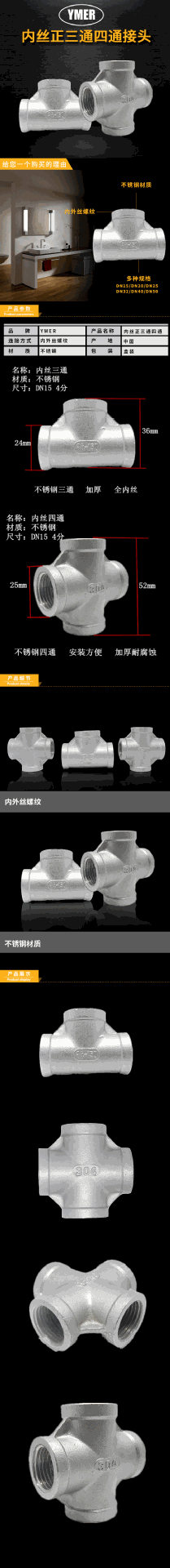 不锈钢内丝三通四通接头4分6分1寸内丝三通DN 15 20