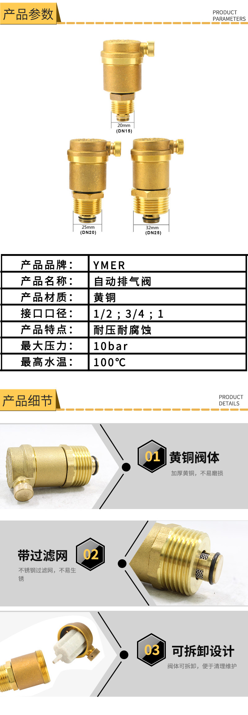 YMER黄铜自动排气阀暖气排气阀 管道水管放气阀4分6分1寸DN15DN20