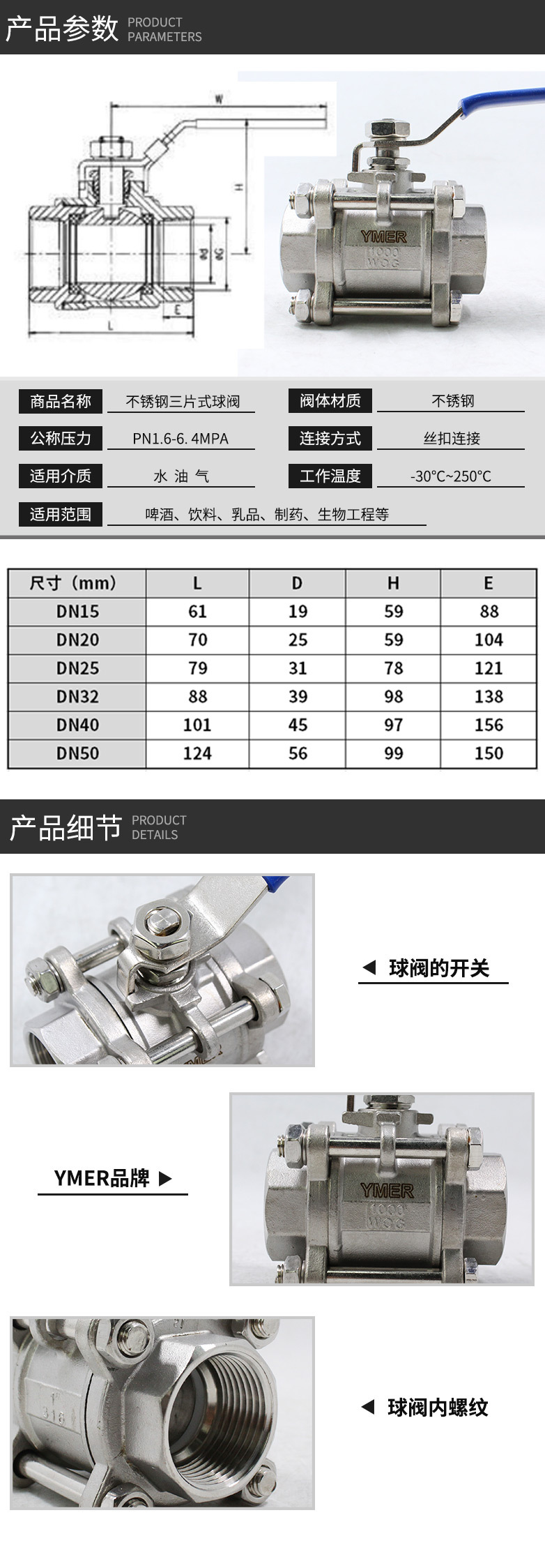 球阀304不锈钢三片式球阀螺纹球阀 丝口球阀4分 6分 1寸