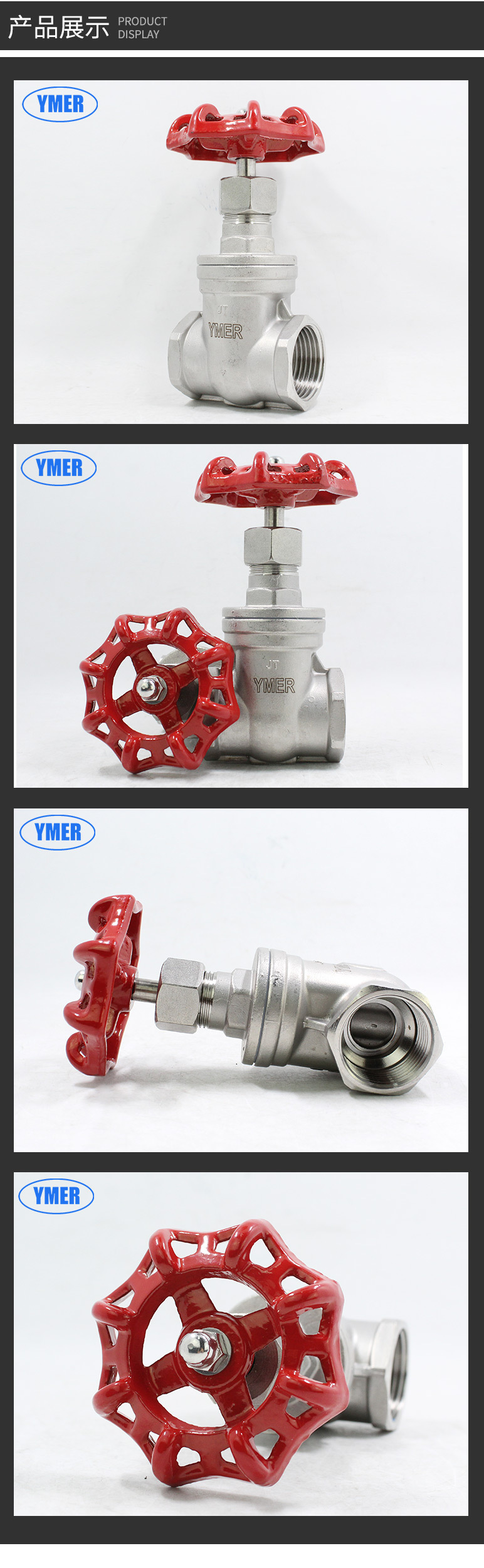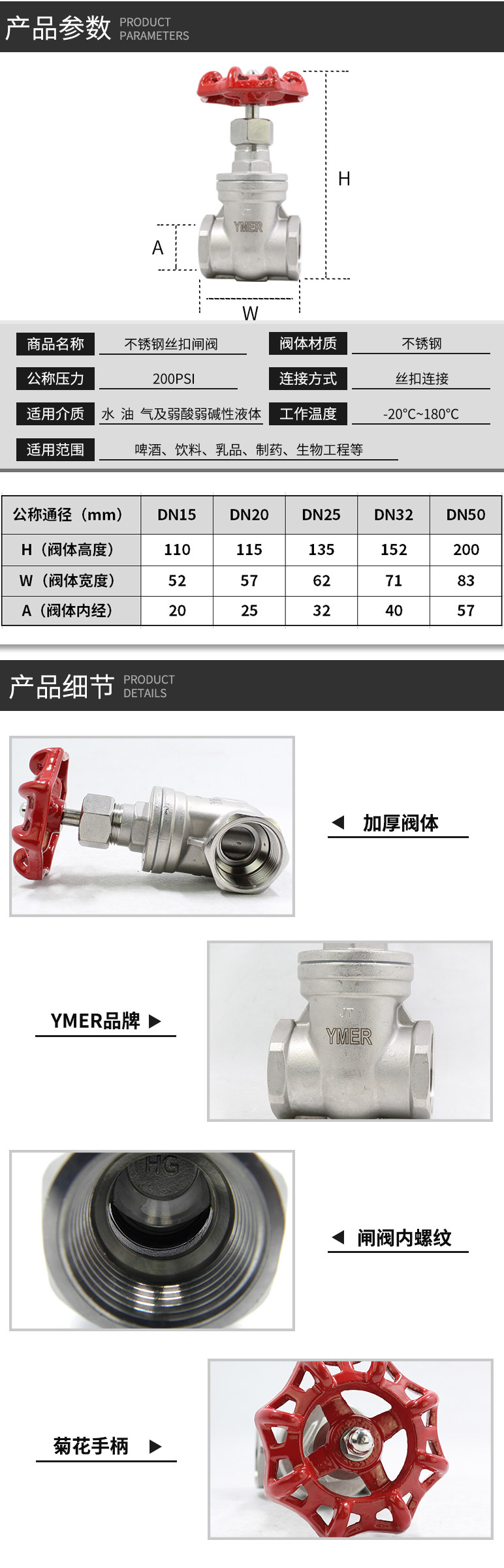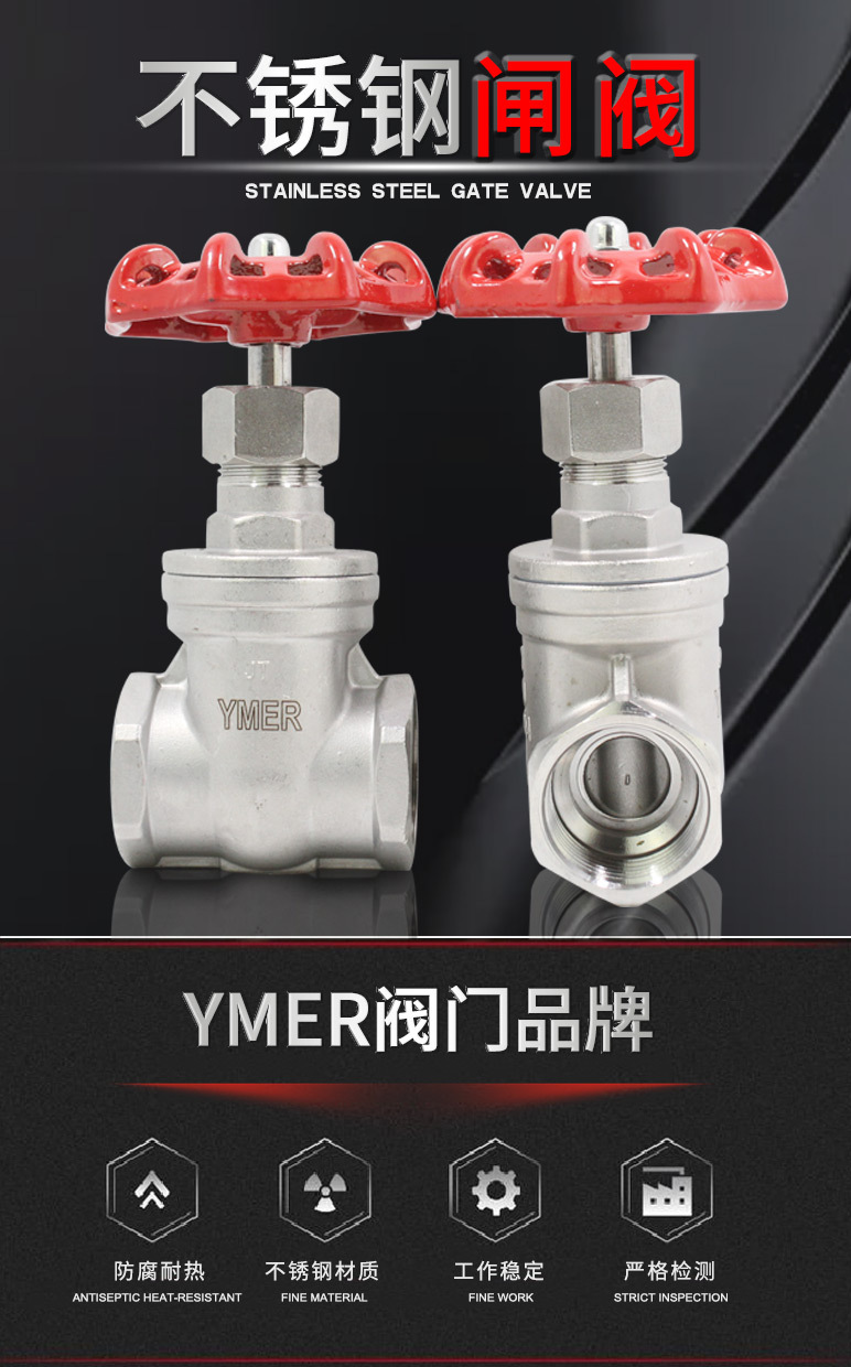 YMER全不锈钢闸阀,内螺纹连接,压力:PN16,耐温:-20-180度,适用于:啤酒机、饮料机、乳品、制药、生物工程,适用介质:水、油气及弱酸弱碱。