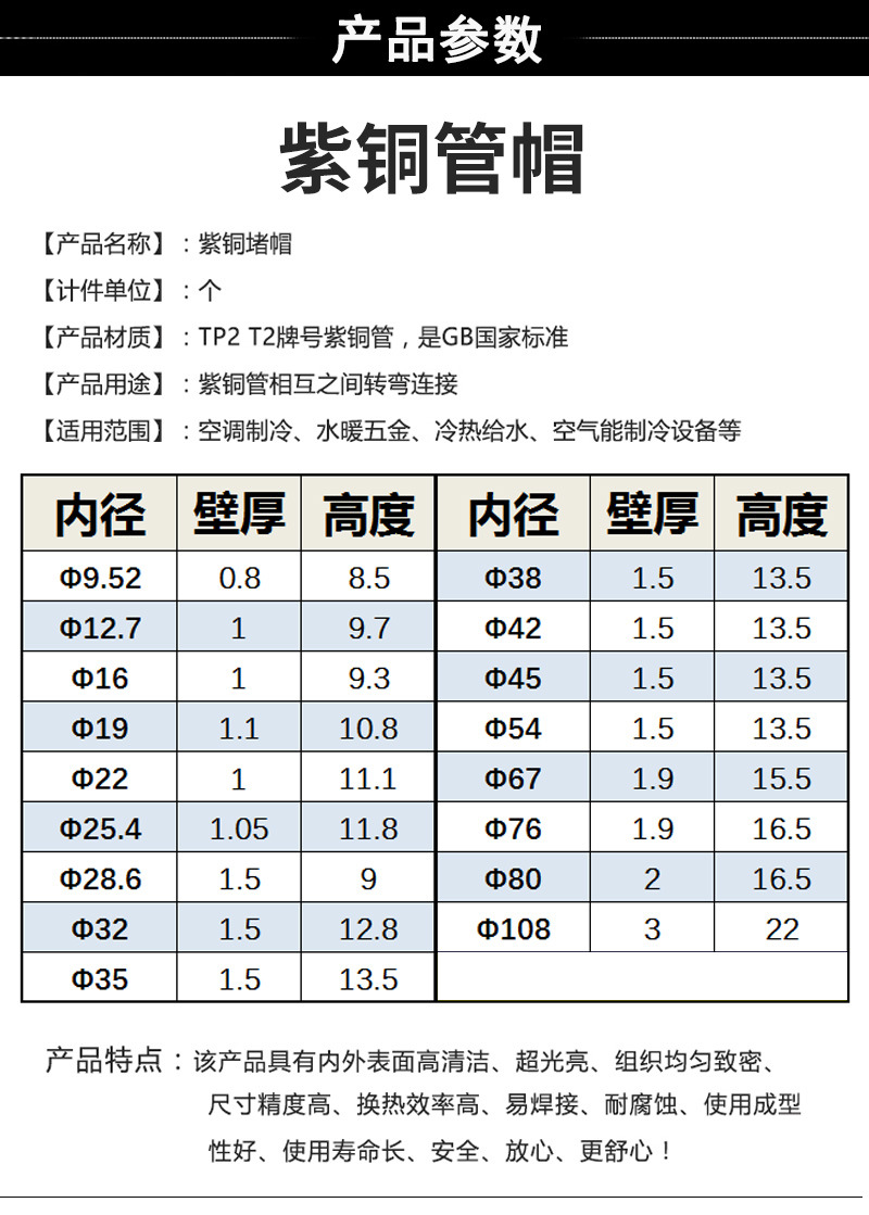 YMER紫铜管帽堵头封帽闷头制冷空调冷库焊接管帽堵头封帽10-108mm