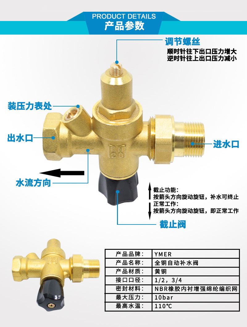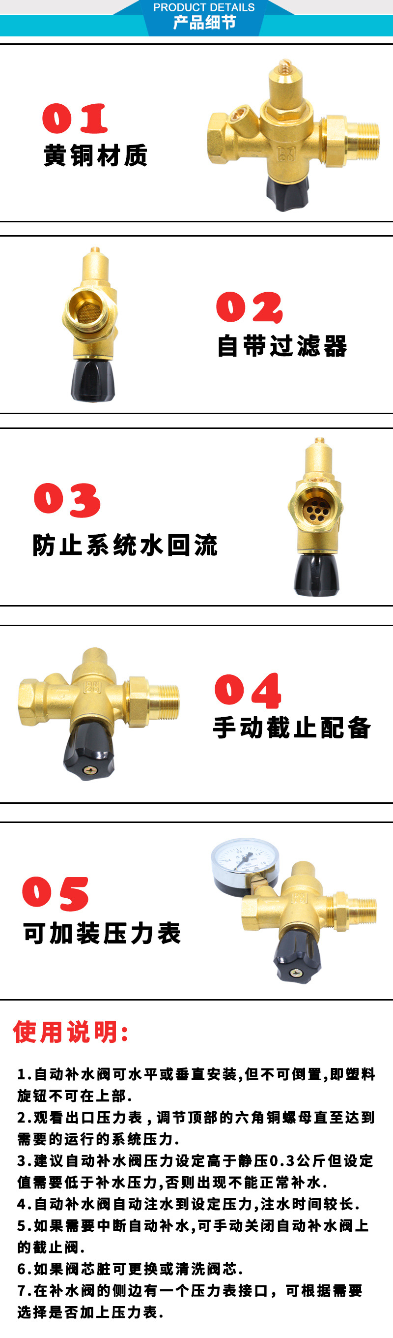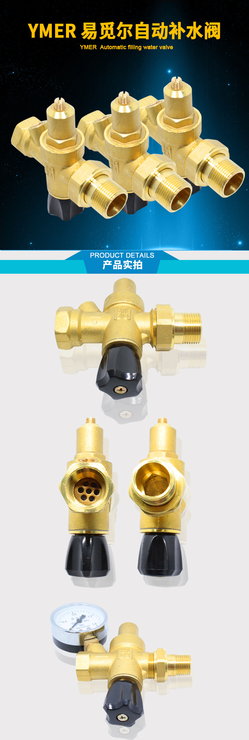 自动补水阀是一种安装在闭式循环的供暖或制冷系统的补水管路上的新型阀门,自动补水阀是由减压阀、不锈钢过滤器、截止阀和止回阀组成。自动补水阀带有减压稳压装置,压力值可配合压力表或根据补水阀刻度进行调节并自动维持调节后系统压力,当系统压力降低时,自动打开注水,到达设定压力时自动关闭,避免水压过高损坏系统设备。自动补水阀带有止回阀,防止系统水在补水水压降低或停水时回流。并防止供热系统的热水回流到冷水管路,为便于维修系统设备,自动补水阀配备手动截止阀,可关闭补水水源。