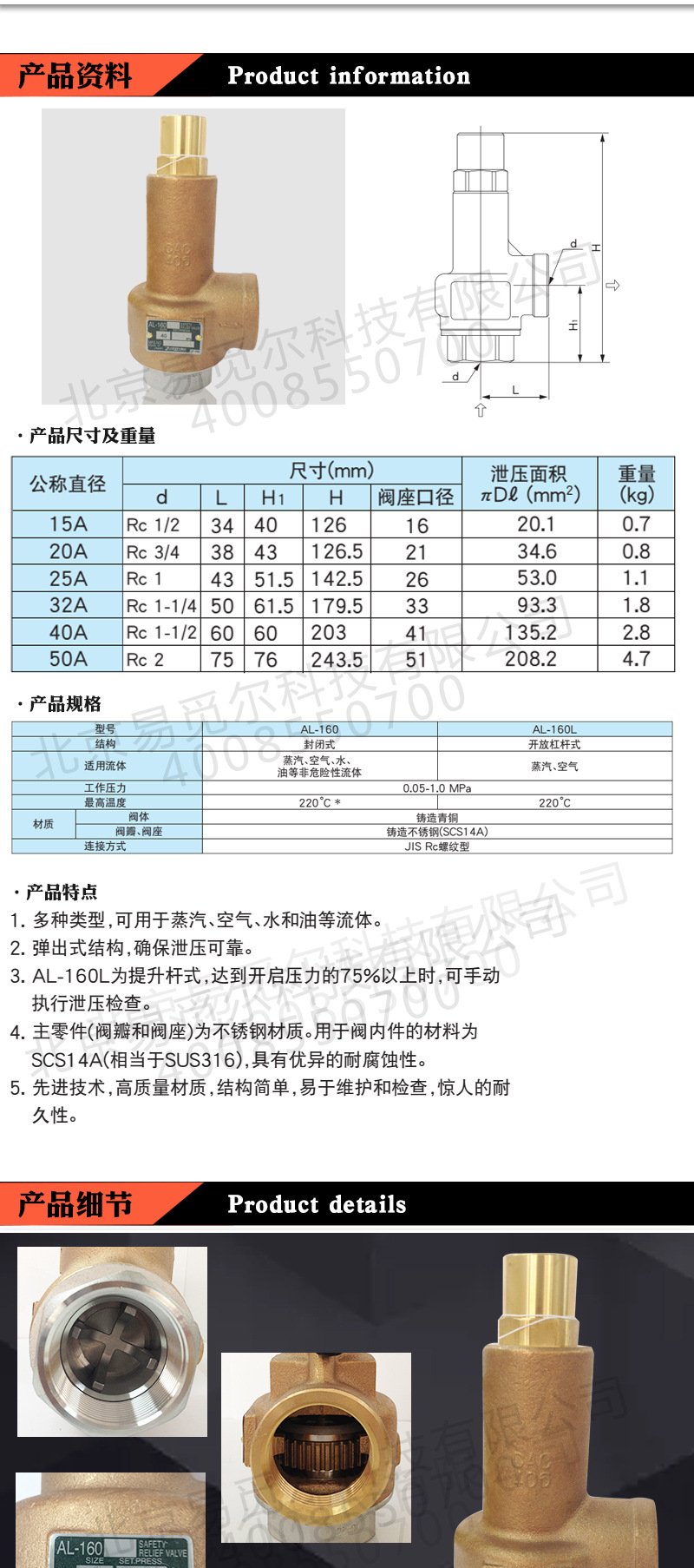 AL-150青铜螺纹安全阀适用介质为:蒸汽、空气、水、油等非危险性流体。安全阀设计小巧量轻,阀体及阀座使用不锈钢316材质具有良好的耐久性,安装调试简单。
