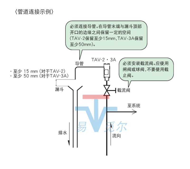 ·考虑到本产品进气口或出气口万一出现有水泄漏,在进气口和出气口上连接导管,将其引到漏斗处(排水沟)。在导管末端与漏斗溢流线
