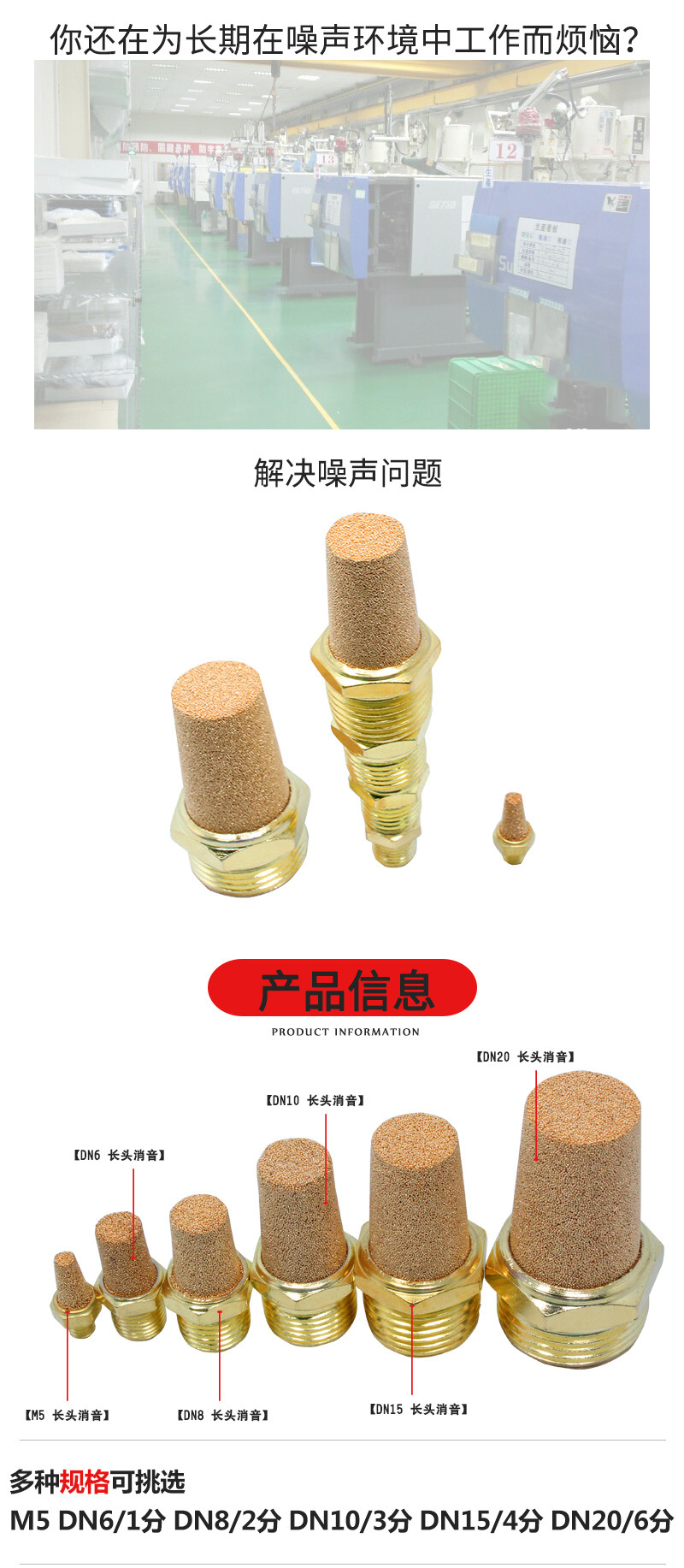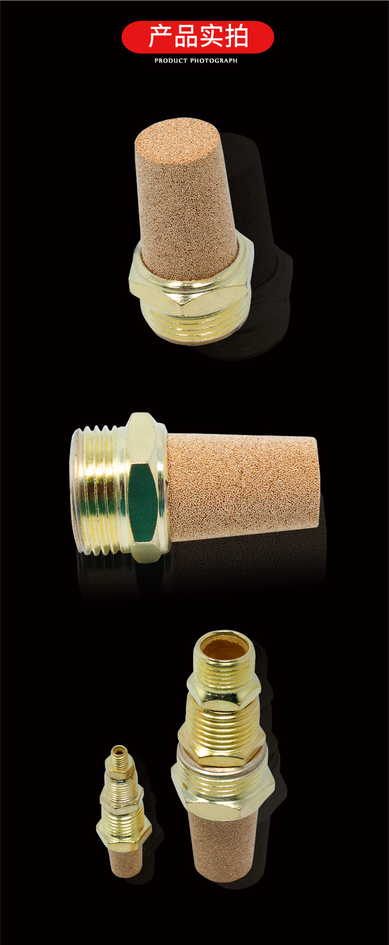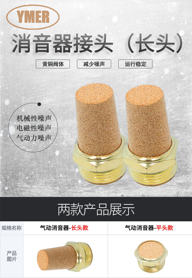 北京YMER公司生产的铜消声器也叫铜消音器,是由具有吸音作用的粉末冶金或不锈钢丝网做为消音材料,铆接以螺纹而成常用规格:G1/8,G1/4,G3/8,G1/2,G3/4