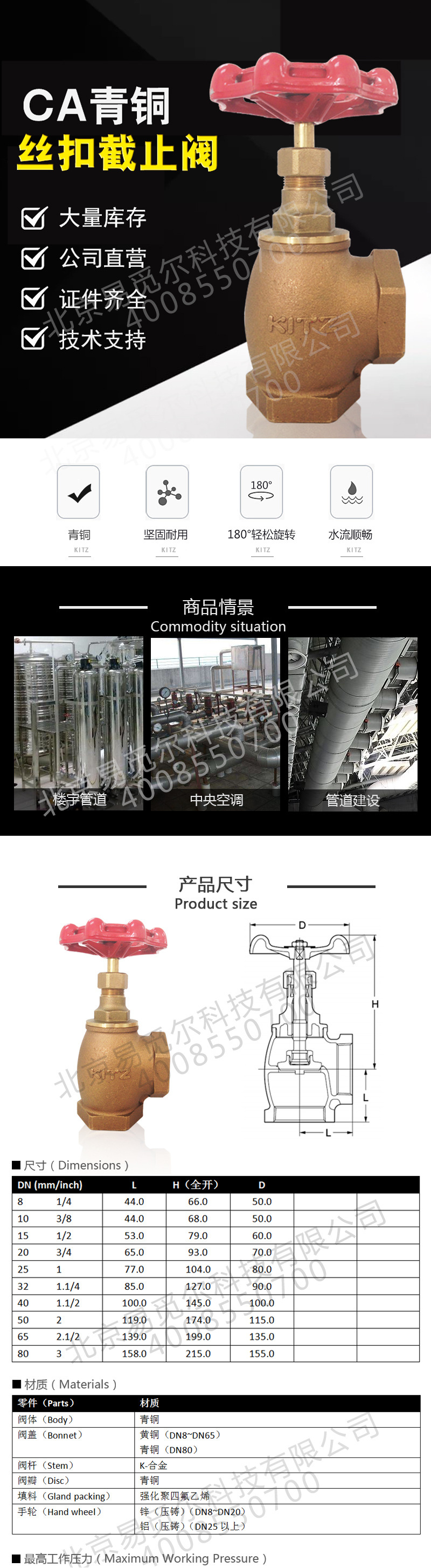 产品名称:CA青铜丝扣角式截止阀KITZ截止阀 产品型号:CA 使用温度:220℃ 使用压力:16kg 适用介质:压力变动小的水·油·气(W.O.G)、饱和蒸汽 产品备注:日本KITZ阀门 销售单位:KITZ阀门 名称:截止阀 压力等级:150 KITZ代号:CA 标准:KITZ RC日标螺纹 产品说明: [适用范围] 2.1MPa压力变动小的水、油、气体(120℃) 1.0MPa饱和蒸汽 CA青铜丝扣角式截止阀的材质: 阀体:青铜 阀盖:青黄铜 阀杆: K-合金 阀瓣:青铜