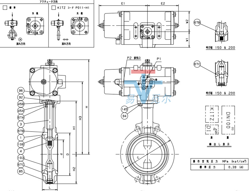 日本北泽KITZ FAS-16DJ气动对夹式蝶阀外形结构图: