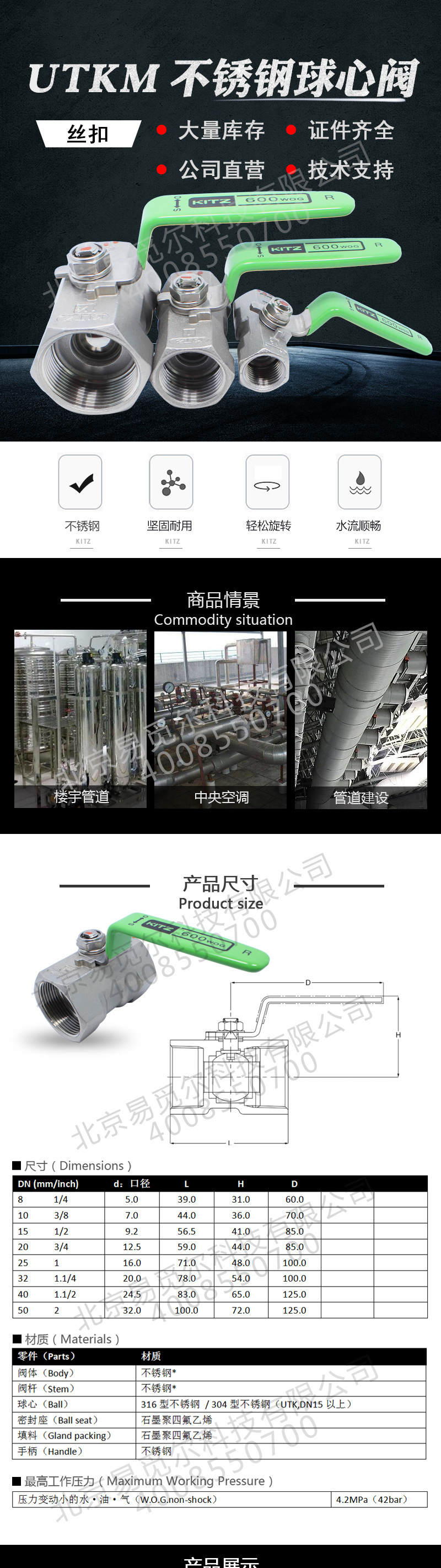 产品说明: 600psi.水蒸汽用于室温 材质 阀体:CF8M 阀盖:CF8M 阀杆:316不锈钢 球心:316不锈钢 阀座: PTFE E-E:KITZ标准