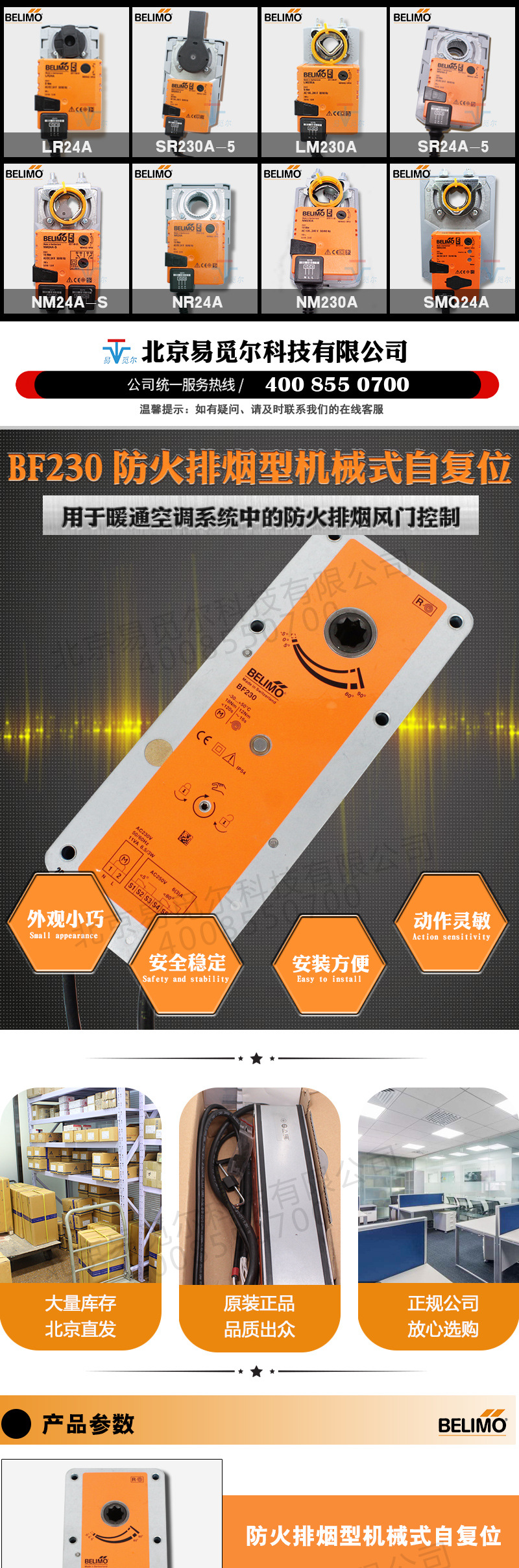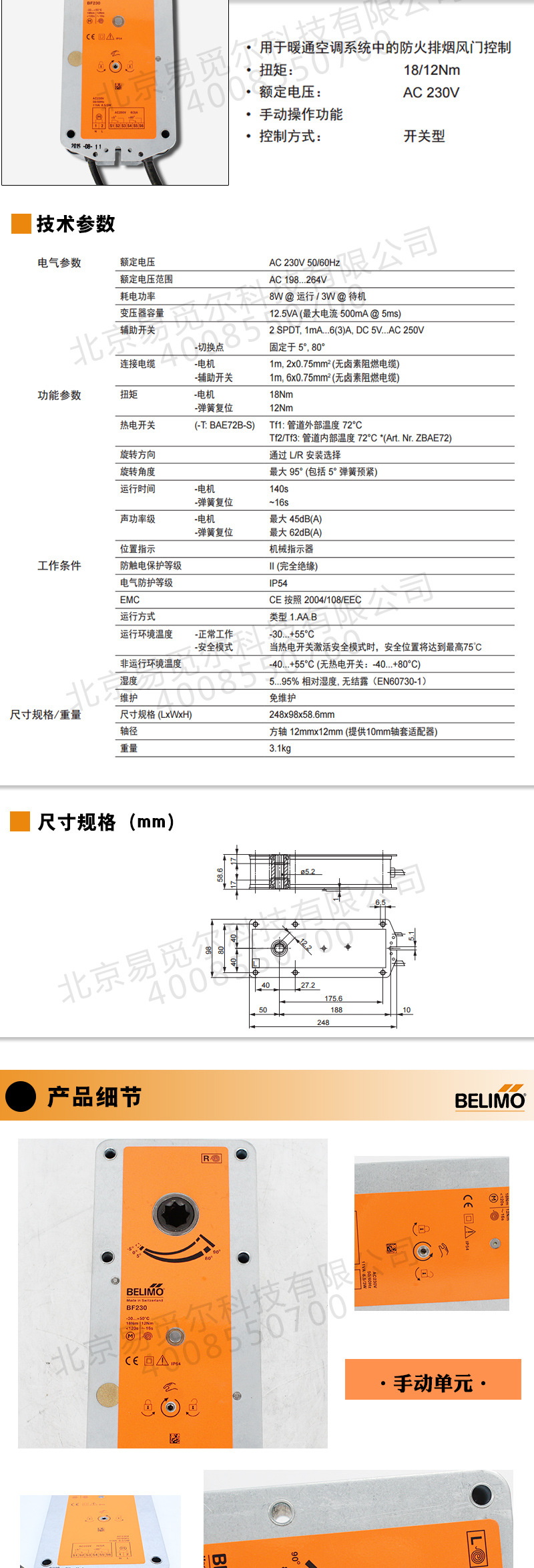 BF230防火排烟型机械式自复位风门执行器用于暖通空调系统中的防火排烟风门控制,扭矩18/12NM,额定电压AC230V,具有手动操作功能,控制方式为开关控制。
