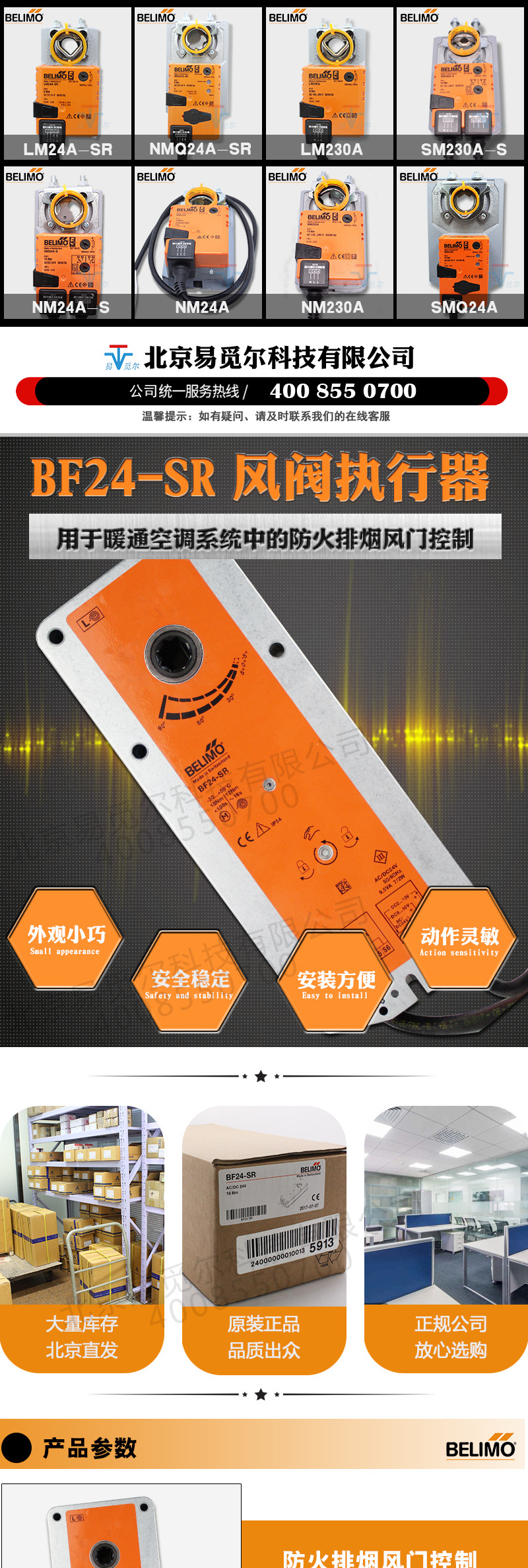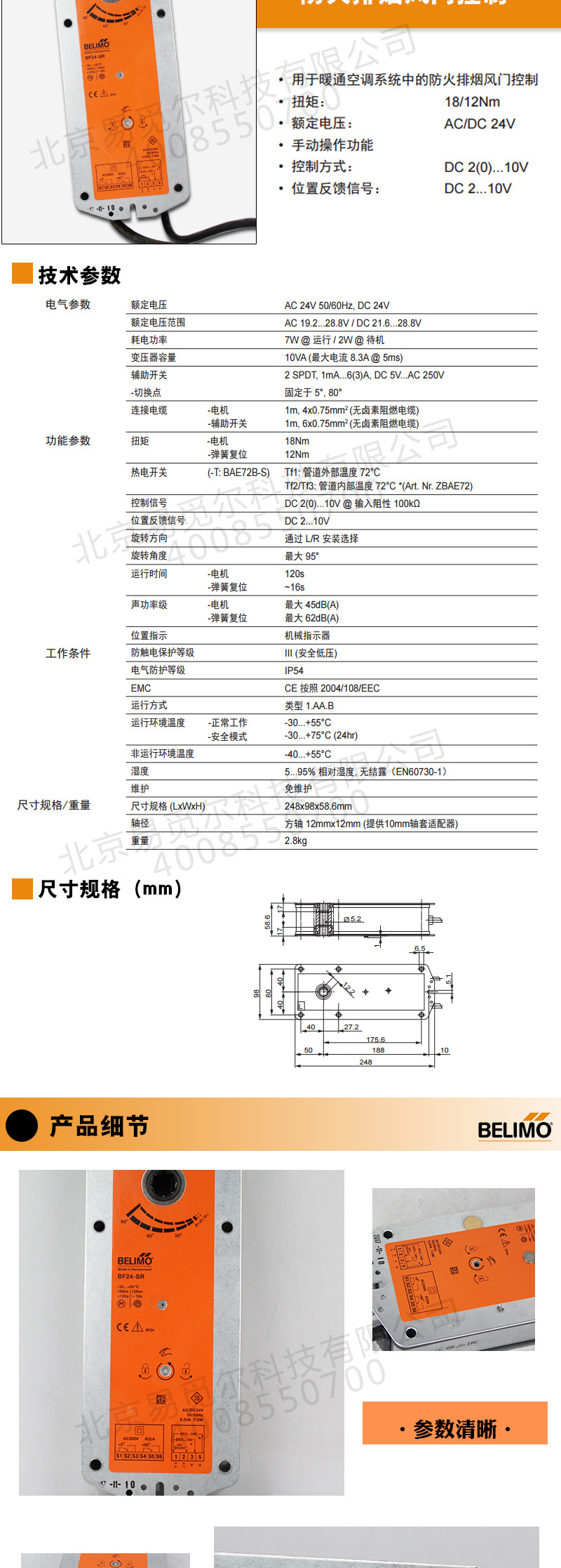 BF24-SR防火排烟型机械式自复位风门执行器用于暖通空调系统中的防火排烟风门控制,扭矩18/12NM,额定电压AC/DC24V,具有手动操作功能,输入信号DC2-10V,位置反馈信号DC2-10V。