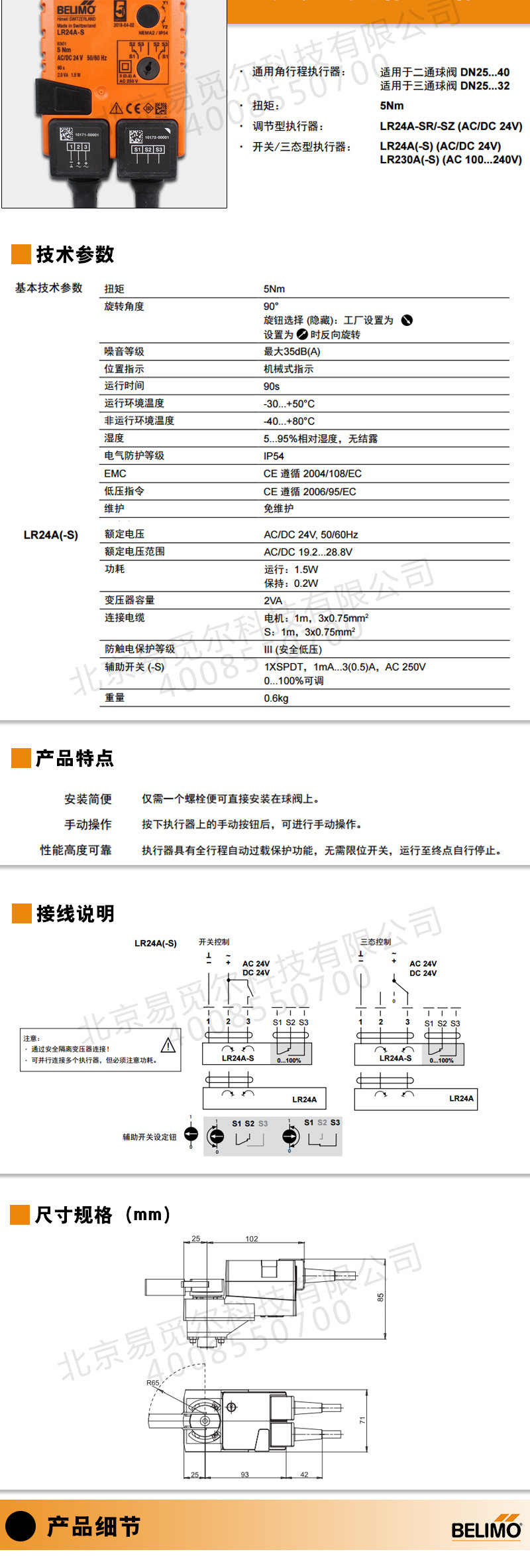 辅助开关 (-S) : 1XSPDT, 1mA...3(0.5)A, AC 250V 0...100%可调 重量 :0.6kg