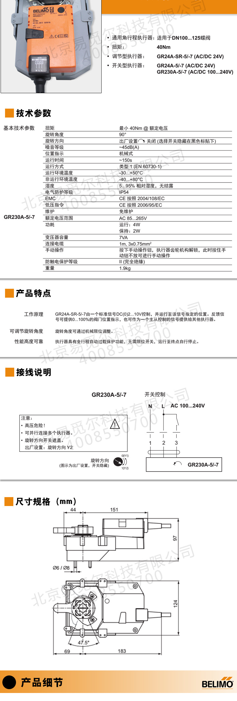 扭矩最小 40Nm @ 额定电压旋转角度90°旋转方向出厂设置关闭 (选择开关隐藏在黑色标贴下)噪音等级~45dB(A)位置指示机械式运行时间~150s运行方式类型 1 (EN 60730-1)运行环境温度-30...+50°C非运行环境温度-40...+80°C湿度5...95% 相对湿度,无结露电气防护等级IP54EMCCE 按照 2004/108/EC低压指令CE 按照 2006/95/EC