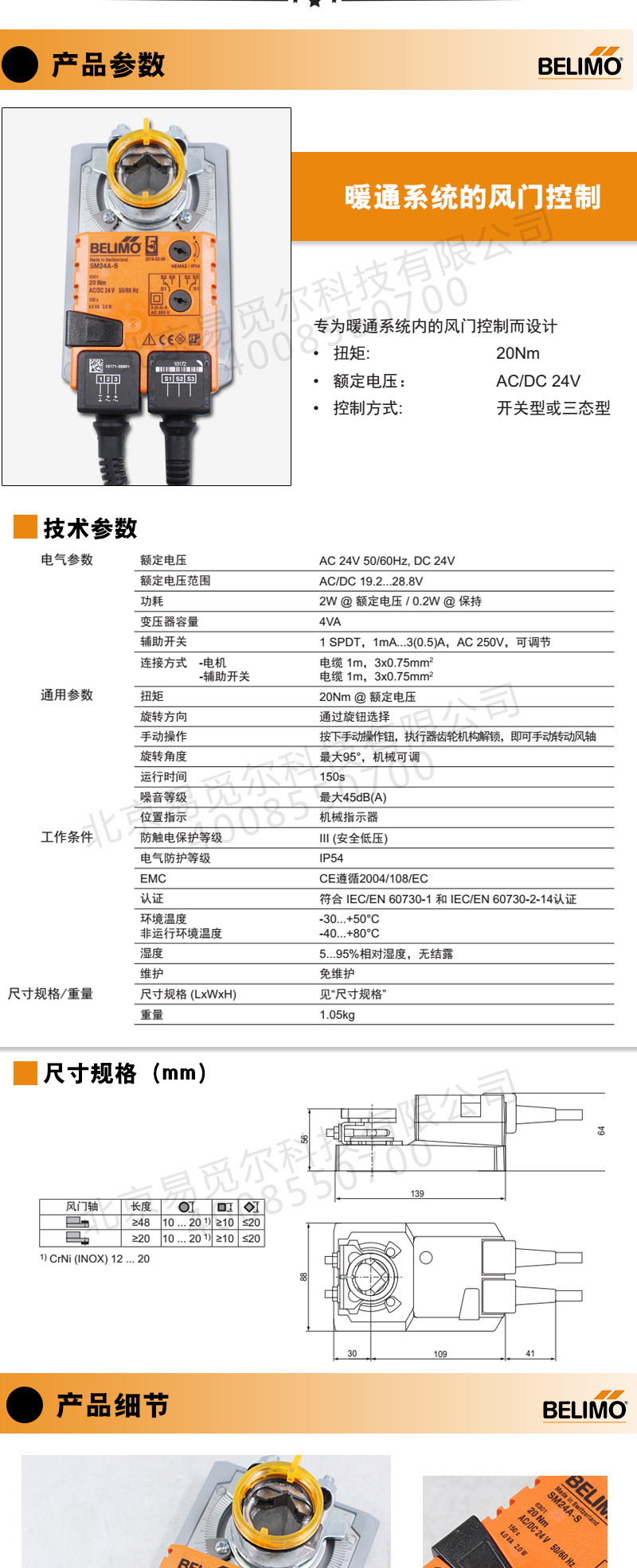 旋转方向通过旋钮选择手动操作按下手动操作钮,执行器齿轮机构解锁,即可手动转动风轴旋转角度95°,机械可调运行时间150s噪音等级45dB(A)位置指示机械指示器防触电保护等级III (安全低压)电气防护等级IP54EMCCE遵循2004/108/EC认证符合 IEC/EN 60730-1 和 IEC/EN 60730-2-14认证环境温度非运行环境温度-30...+50°C-40...+80°C湿度5...95%相对湿度,无结露
