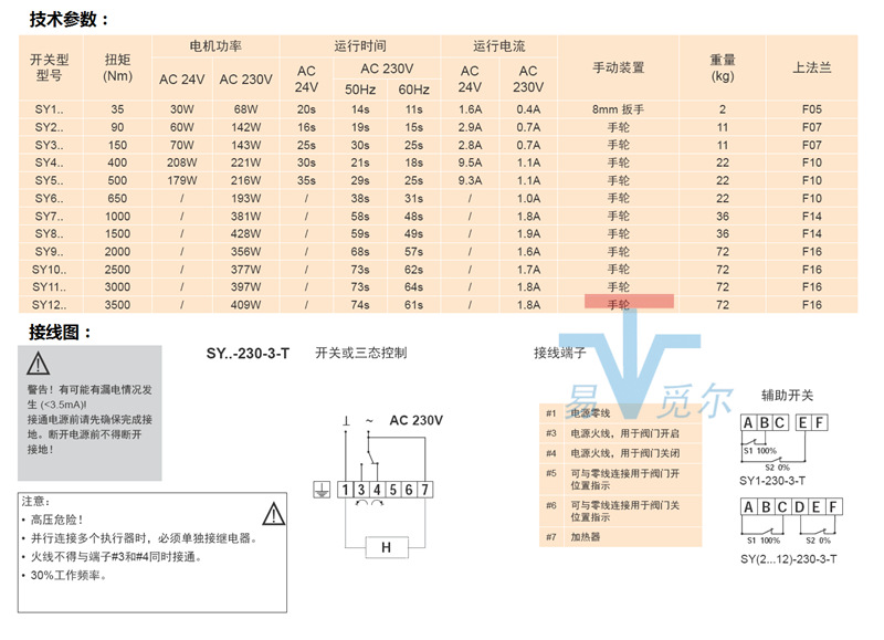 辅助开关 2xSPDT 3A, AC 230V(SY1); 2xSPDT 5A, AC 230V(SY2...12)