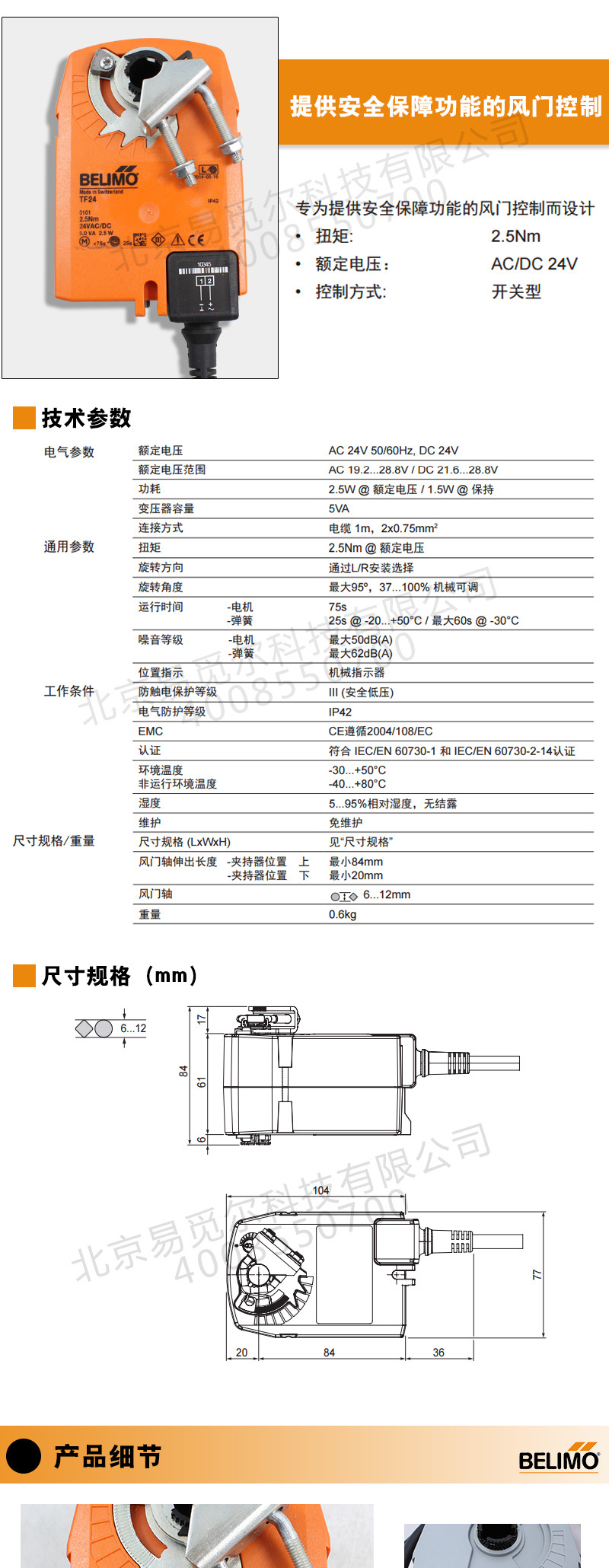 扭矩:2NM 控制方式:开关控制 (单线控制) 额定电压:AC/DC24 50/60HZ 额定电压范围:AC19.3...28.8V