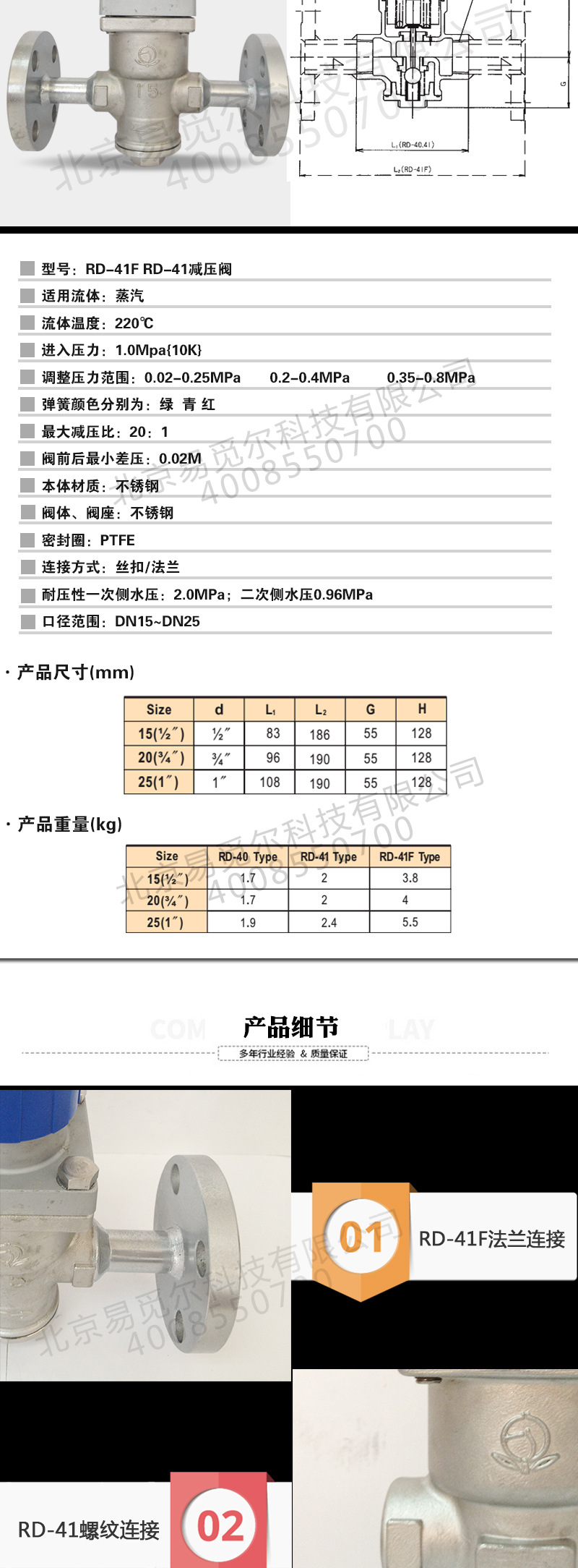 RD-41/F减压阀为螺纹不锈钢小型减压阀,适用于食品机械、厨房机械、医疗机械的蒸汽系统减压,属于小型的蒸汽减压阀,分为3种不同的减压范围,分别用RD-41L、 RD-41M 、RD-41H三种型号来区别,三种型号的减压范围分别为:一次压力1.0mpa;二次压力:RD-41FL型为:0.02~0.25mpa; RD-40FM型为:0.2~0.4mpa; RD-40FH型为 0.35~0.8mpa。