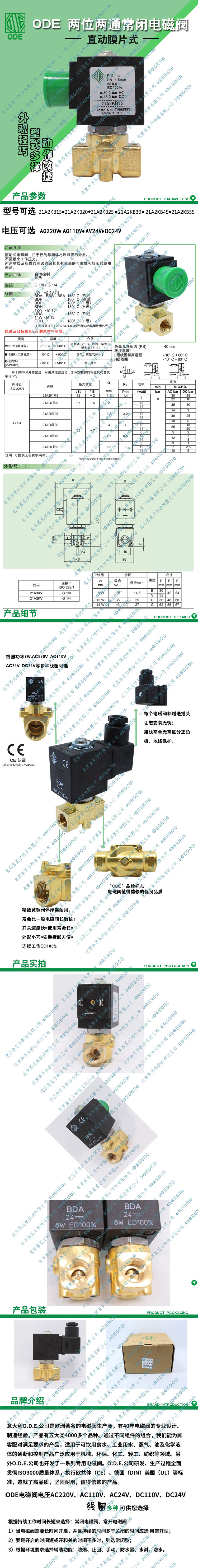 21a2kb15是意大利ODE两位两通电磁阀,属于直动式常闭型,黄铜阀体丝扣连接,口径DN8,流通孔径1.5mm,流动系数1.4L/min,粘度不超过12cSt,匹配8W线圈时,交流耐压30bar,直流耐压18bar.