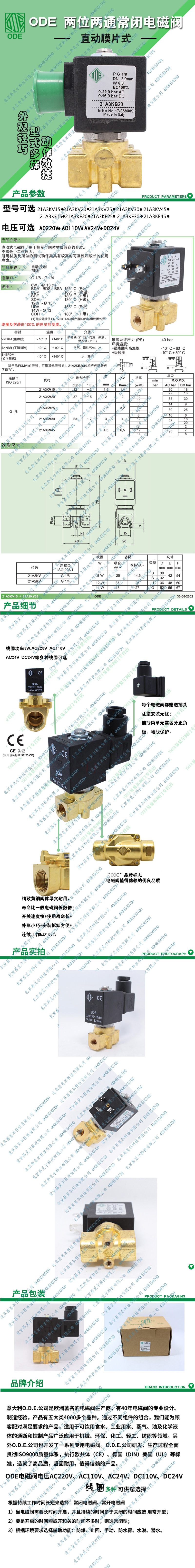 意大利ode电磁阀 21a3kb20是两位两通电磁阀,属于直动式,21A3KB20流通介质粘度不超过37cst,流通孔径2mm,流动系数2L/min,匹配8W线圈时,AC耐压不超过22bar,DC耐压不超过16bar;匹配14W线圈时,AC耐压不超过35bar,DC耐压不超过30bar.