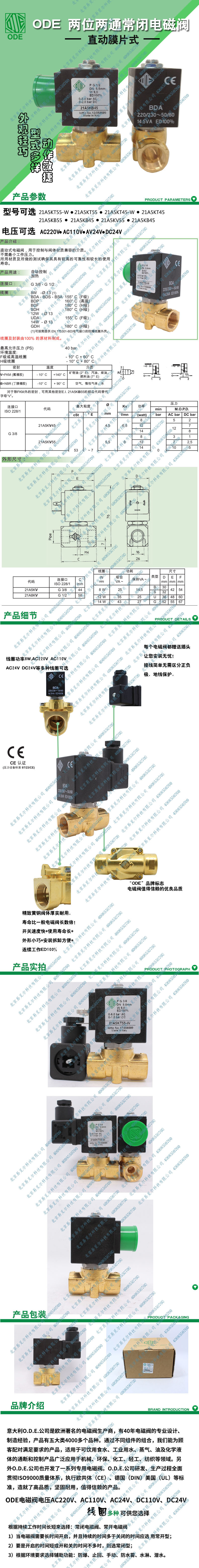 意大利ODE电磁阀21a5kb45两位两通常闭电磁阀,是直动膜片式电磁阀,粘度为53cSt(~7°E),流通孔为4.5mm,流量系数是6.5L/min,常规是匹配8W线圈