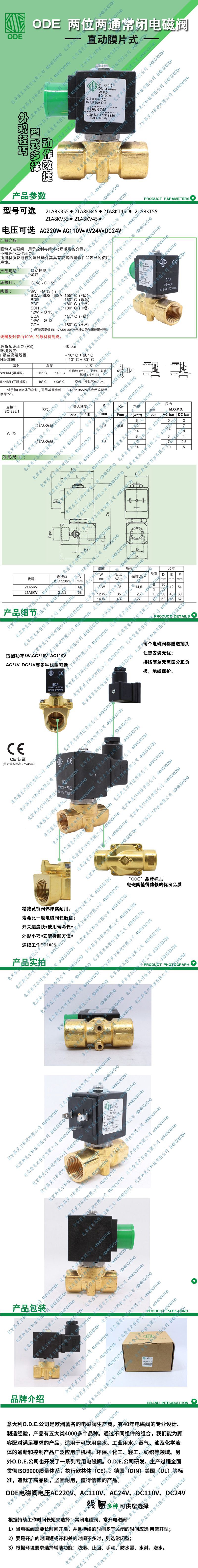 21a8kt45是意大利ODE两位两通常闭电磁阀,属于直动式电磁阀,流通孔径4.5mm,流动系数6.5L/min.