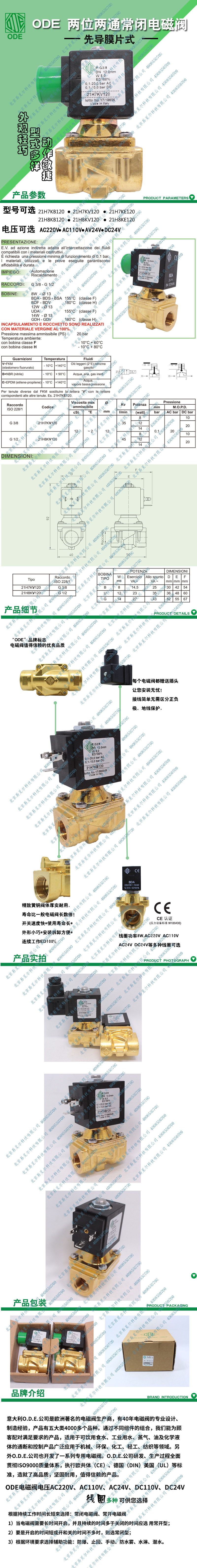 21h7kv120意大利ODE电磁阀是两位两通常闭电磁阀,属于先导膜片式,粘度不超过12cSt,流通孔径12mm,流动系数35L/min,