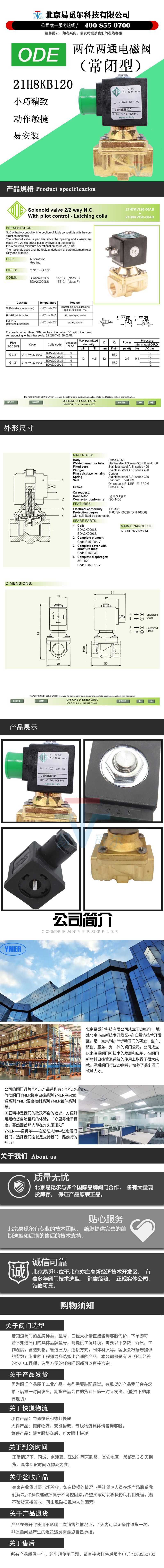 21H8KB120是意大利ODE电磁阀,21H8KB120是两位两通常闭电磁阀,属于先导控制式,21H8KB120通过介质粘度不超过12cst,流通孔径12mm,流动系数45L/min,匹配8W线圈时,AC耐压不超过20bar,DC耐压不超过10bar;匹配14W线圈时,AC耐压不超过20bar,DC耐压不超过20bar.