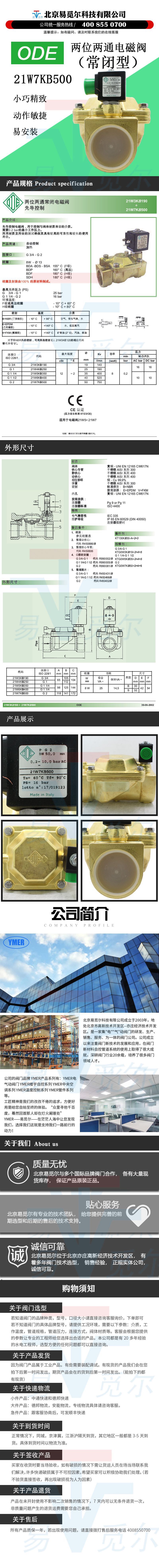21w7kb500是意大利ODE两位两通常闭型电磁阀,属于先导控制式,口径DN50,流通孔径50mm,流动系数750L/mm,匹配8W线圈时,交流耐压10bar,直流耐压10bar.