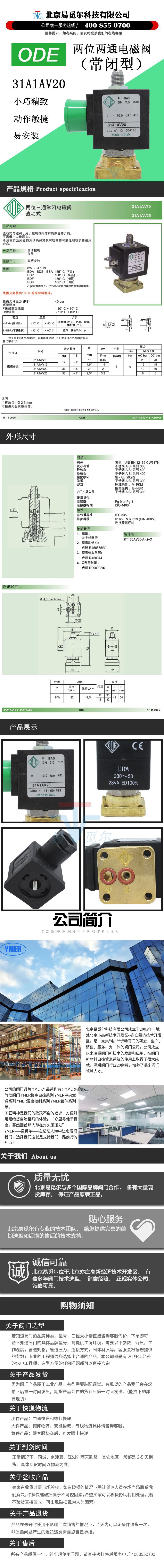 意大利ODE电磁阀31A1AV20是两位三通常闭型电磁阀,属于直动式电磁阀,底板安装,31A1AV20流通孔径2mm,流动系数2L/min,匹配8W线圈时,交流耐压10bar,直流耐压10bar.