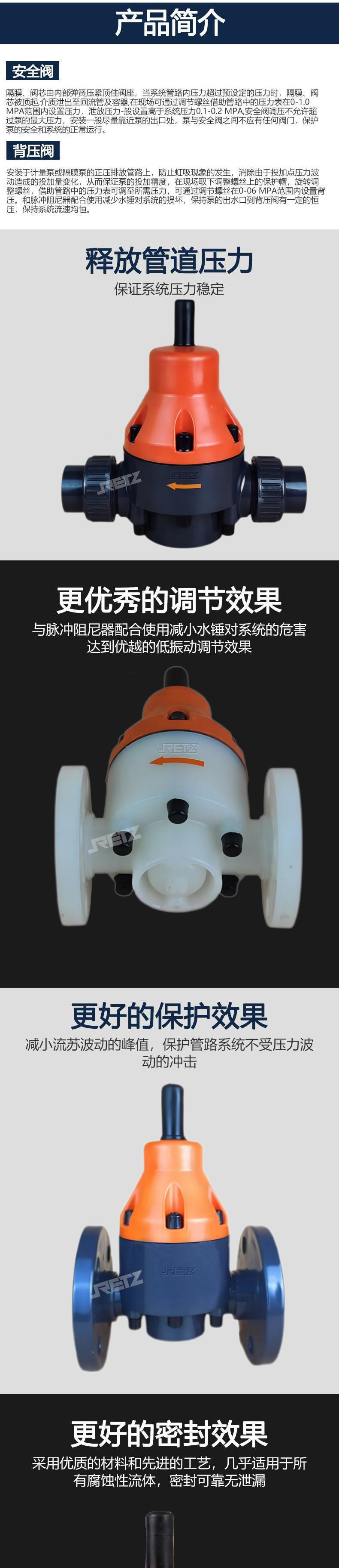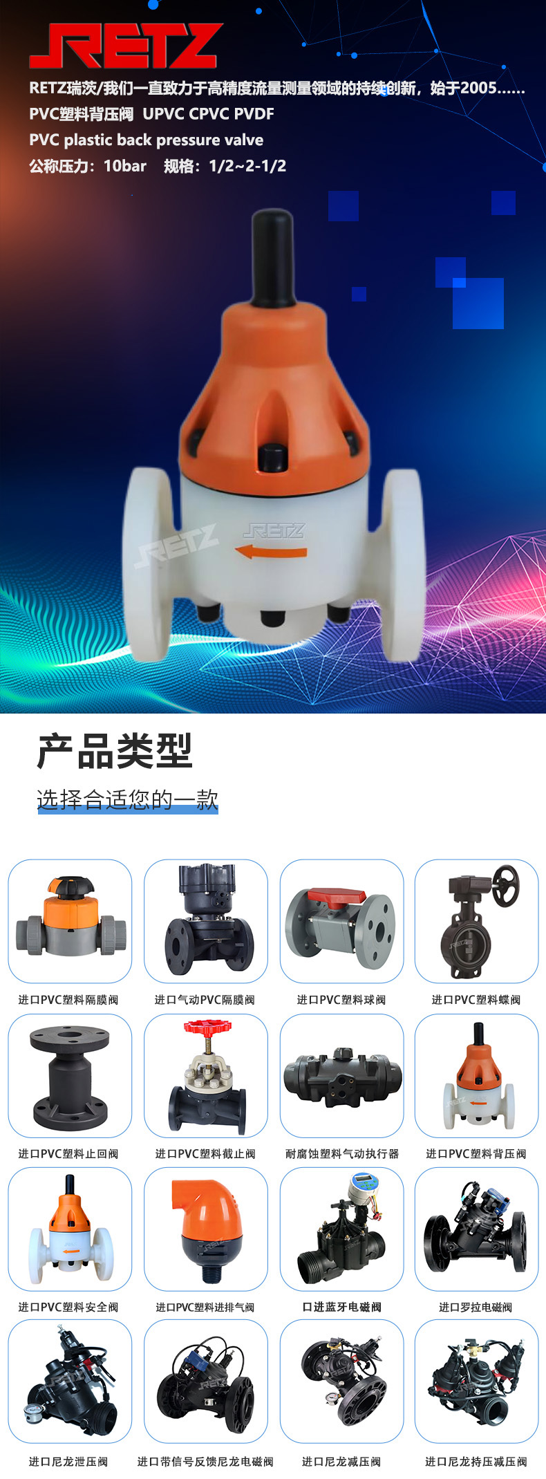 RETZ's PVC valves can meet the requirements of cutoff, safety, anti-corrosion, and emission control in industrial control systems. The products include imported PVC diaphragm valves, butterfly valves, ball valves, safety valves, back pressure valves, dampers, solenoid valves, and hydraulic control valves.