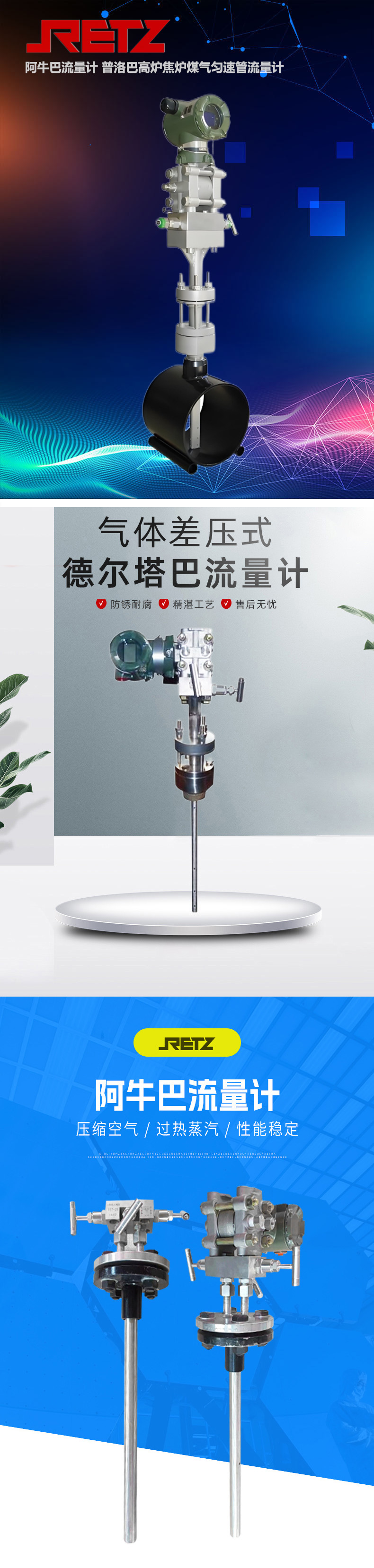 RETZ阿牛巴流量计(又称笛形均速管流量计和托巴管流量计)属于差压式流量计。 阿牛巴流量计采用皮托管测量原理测量挡体上游的动压力与下游的静压力之间形成的压差,从而达到测量流量的目的。测量管道直径在DN20到DN12000之间。阿牛巴流量计主要用于工业过程中各种能源如液体、燃料气、蒸气和气体的测量,具有较高的稳定性和重复性。设计理论符合伯努力方程原理,并可用JJG/640-90规程进行检验。HW-ANB系列阿牛巴流量计以其安装简便、压损小、强度高、不受磨损影响、无泄漏等特点而成为替代孔板的理想产品。