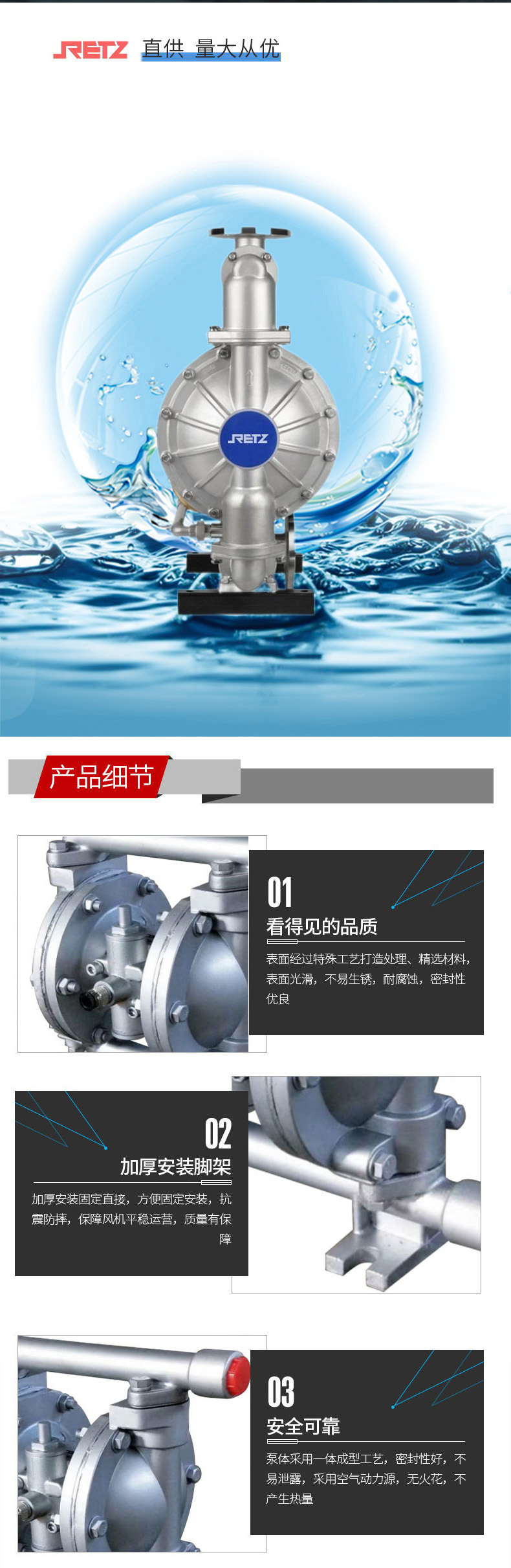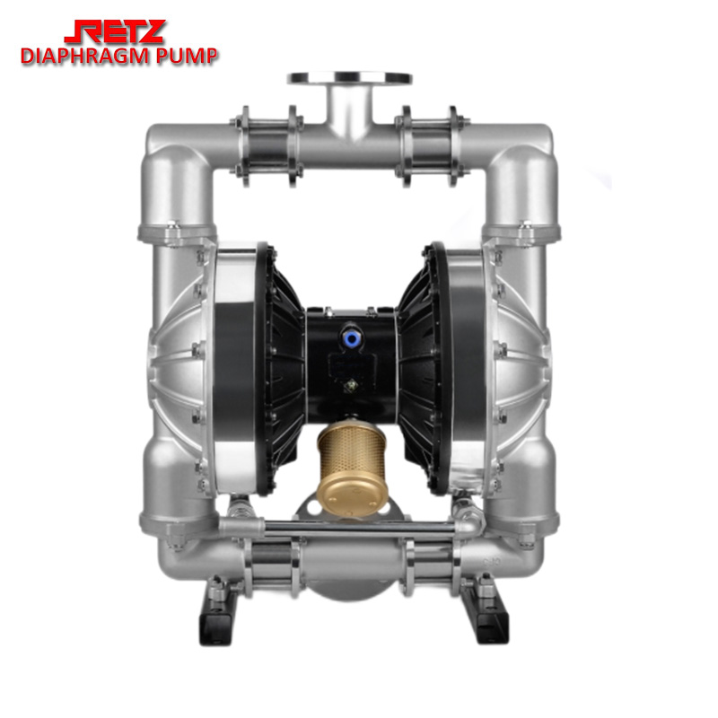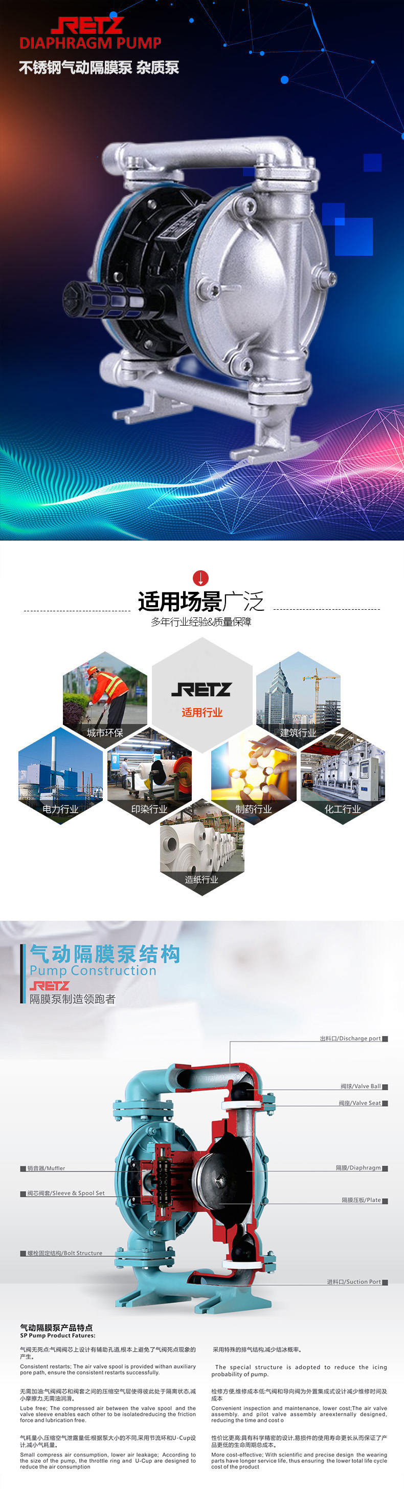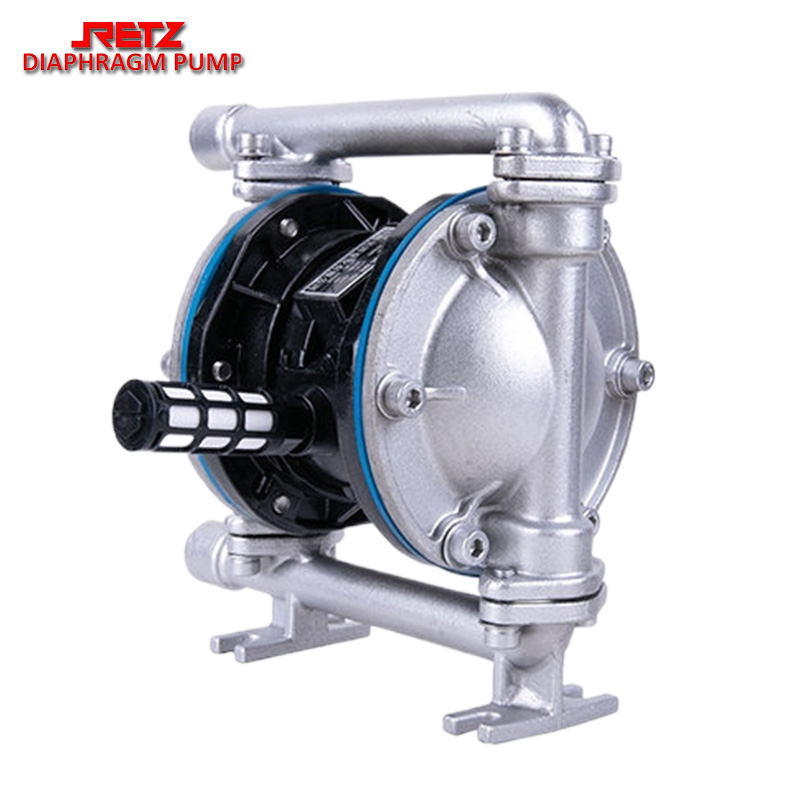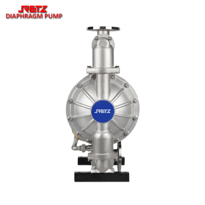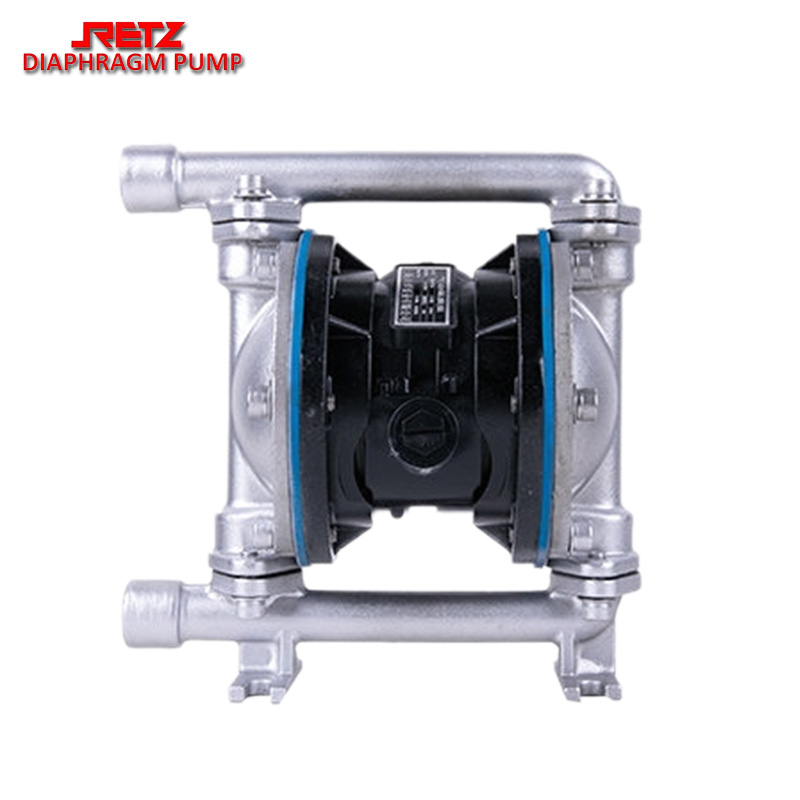 retz不锈钢气动隔膜泵采用压缩空气为动力源。对于各种腐蚀性液体,带颗粒的液体,高粘度、易挥发、易燃、剧毒的液体,均能予以抽光吸尽