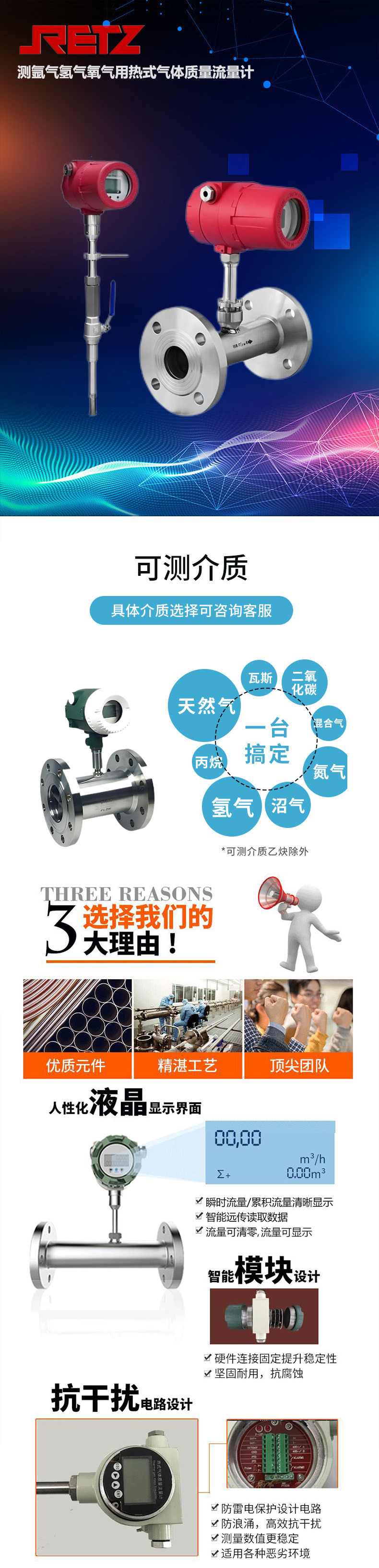 RETZ热式气体质量流量计是基于热扩散原理而设计的,该仪表采用恒温差法对气体进行准确测量。具有体积小、数字化程度高、安装方便,测量准确等优点。