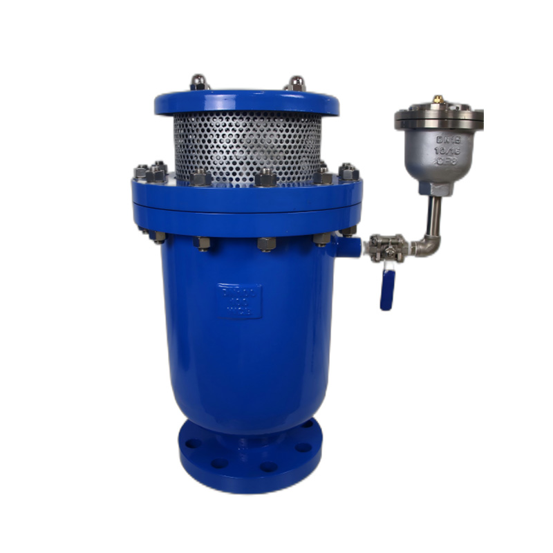 3.快速吸气。当管道内水流中断或产生负压时,主浮球会下落,打开主排气口,快速吸入气体,补充到管内,以保护管道不受损坏。同时通过阀内流道结构的独特设计,可以实现进气量及进气速度可控。