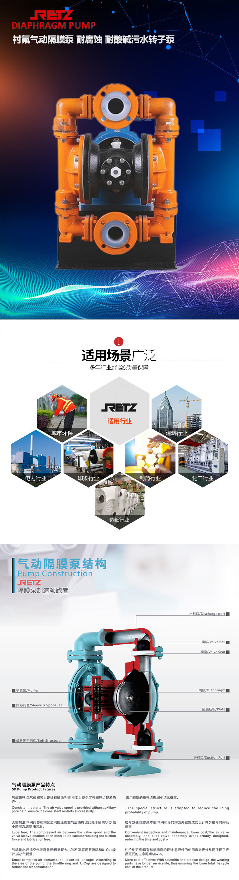 retz衬氟气动隔膜泵是一种采用压缩空气为动力源的新型隔膜泵产品,与传统衬氟泵具有良好的通用性和互换性,可在-20℃—+80℃温度条件下长期输送各种腐蚀性、带颗粒、高粘度、易燃、剧毒、易挥发液体介质,应用行业广泛
