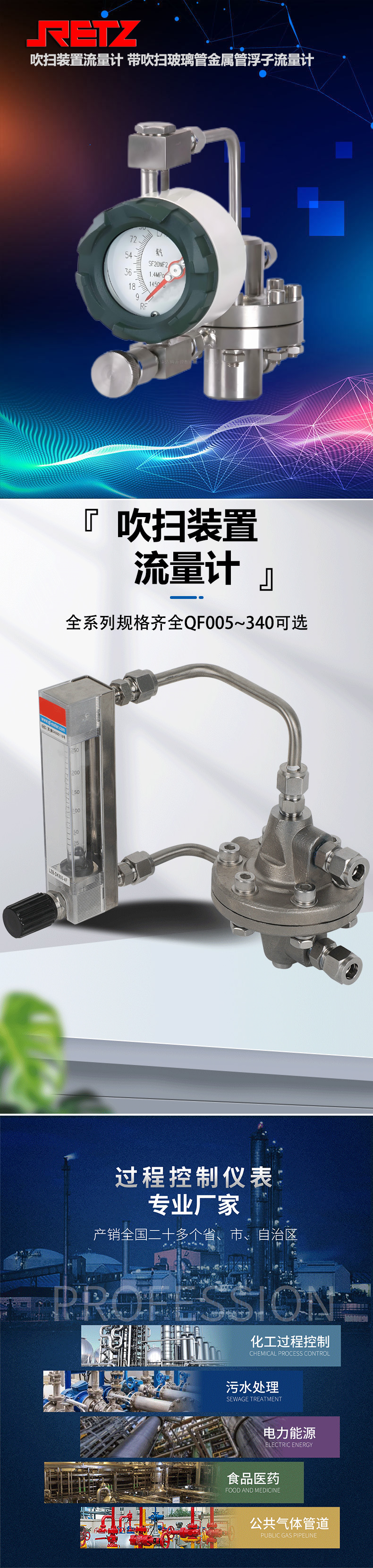 RETZ吹扫装置流量计采用金属管浮子或玻璃转子流量计与恒流阀配合,构成流量吹扫装置,实现流量测量并确保流量恒定输出。
