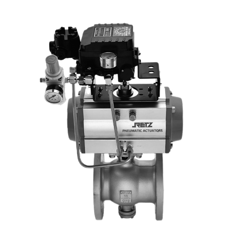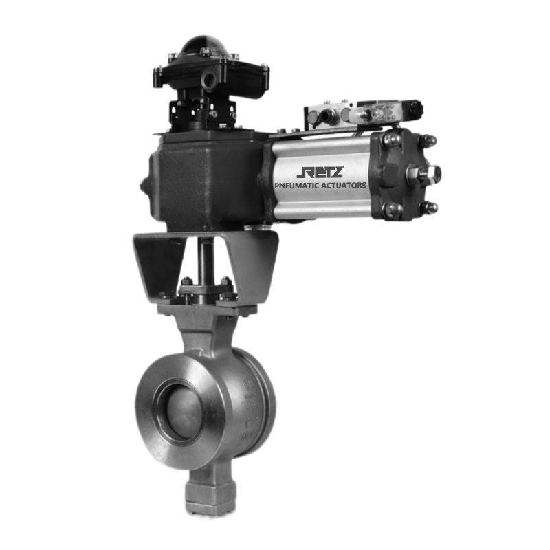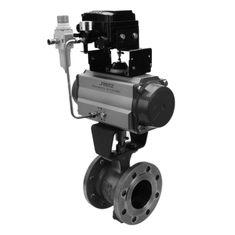 调节型气动V球阀的关闭件是半球体上开有V字型开口,V型开口具有锋利的刃口,在球体回转过程中,关闭件之间有擦拭作用,对介质具有强有力的切断力,球体的V型开口与阀座流道形成一个扇形区域,在回转过程中可改变流道截面积,形成对介质的调节,它是一种角回转的调节阀,其密封性能与普通球阀相同,使它同时具备调节和开关两种功能,与气动或电动执行器配套,广泛使用于工业过程自控系统中。
