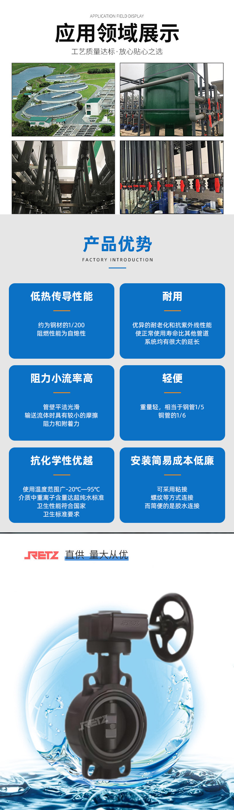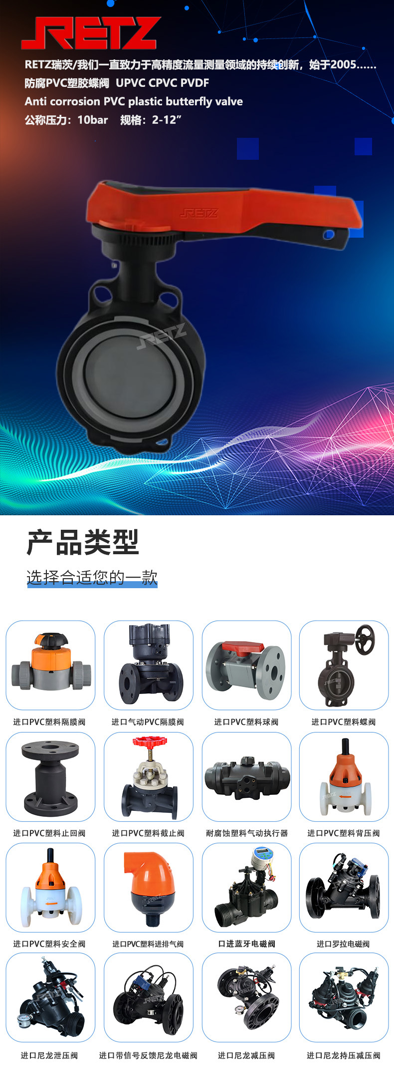 RETZ's PVC valves can meet the requirements of cutoff, safety, anti-corrosion, and emission control in industrial control systems. The products include imported PVC diaphragm valves, butterfly valves, ball valves, safety valves, back pressure valves, dampers, solenoid valves, and hydraulic control valves.
