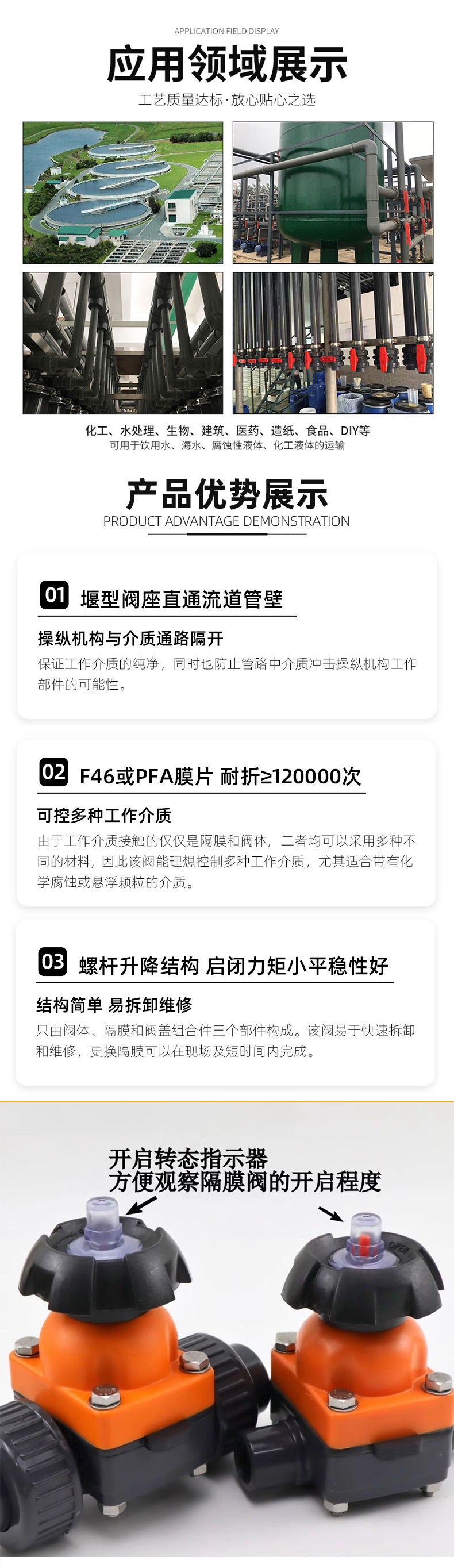 隔膜阀结构无死角,不会污染介质,耐腐蚀性强,无填料磨损,内部密封性能
