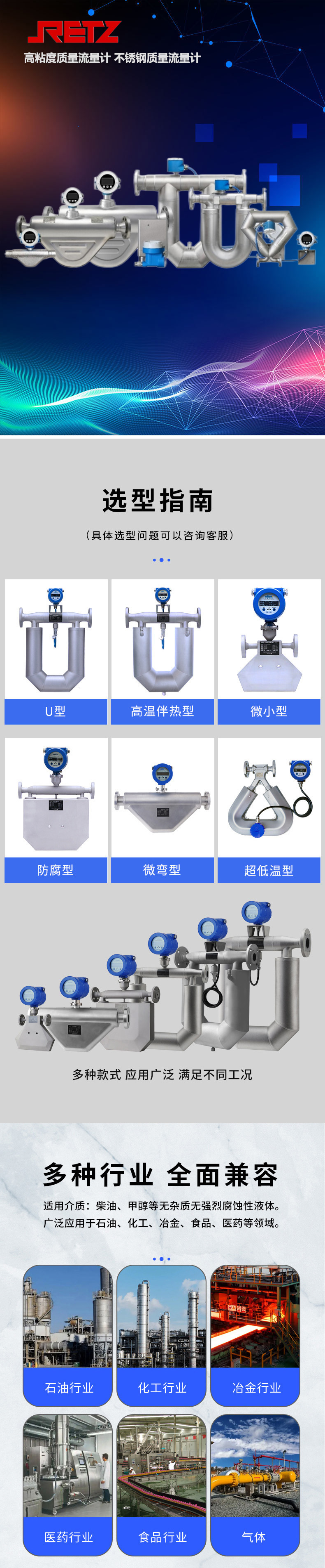 RETZ高粘度质量流量计实现流体质量流量的直接精密测量,而无需任何压力、温度、粘度、密度等换算或修正。其结构是由传感器单元和变送器单元两部分组成。