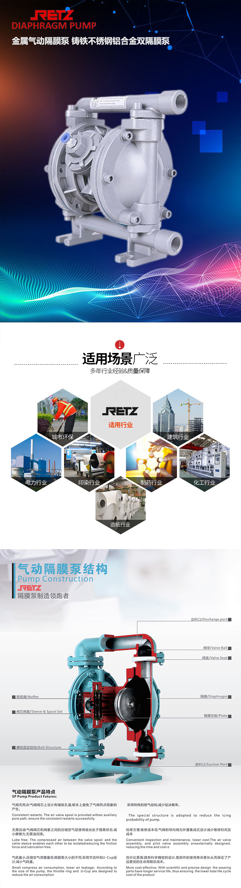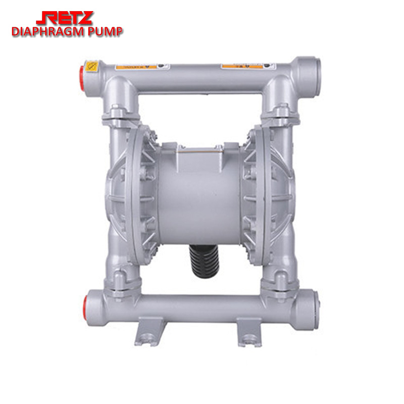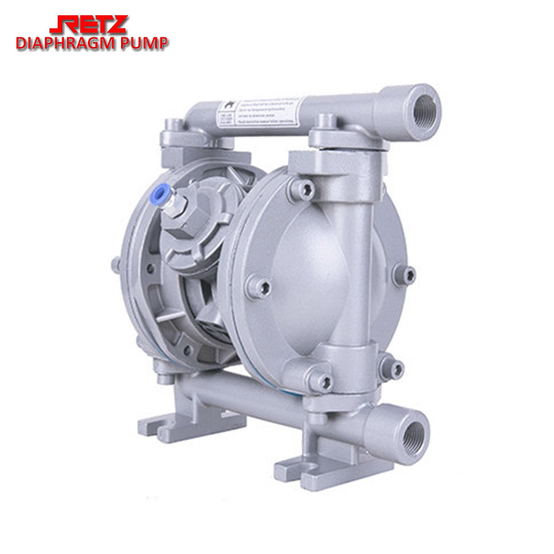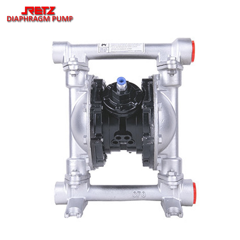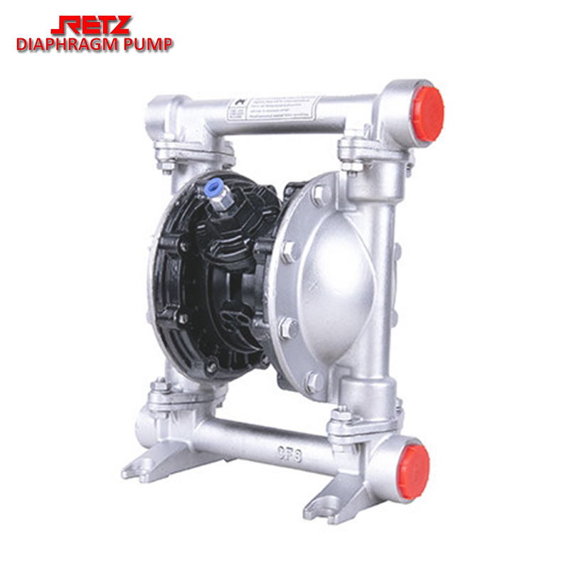 retz金属气动隔膜泵采用压缩空气为动力源,是一种由膜片往复变形造成容积变化的容积泵。具有质量可靠、使用寿命长、噪音底、震动小、不死机、做工精细等六大优点,既能抽送流动的液体,又能输送一些不易流动的介质,具有自吸泵、潜水泵、屏蔽泵、泥浆泵和杂质泵等输送机械的许多优点。