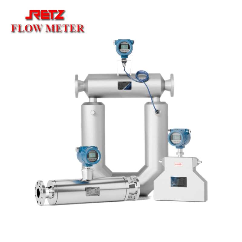 RETZ科里奥利质量流量计简称科氏力质量流量计,一个弯管道的两端被固定,在两个固定点的中间位置给管道施加振动力(按管道的谐振频率),使其以固定点为轴以其自然频率w振动。当管道内没有流体流动时,管道只受外加震动力作用,管道两个半段振动方向相同,没有相位差。当有流体流动时受管道内流动的介质质点科氏力Fc的影响,管道的两个半段按相反的方向发生扭动,产生相位差,这一相位差同质量流量成正比,这就是科氏质量流量计的工作原理。