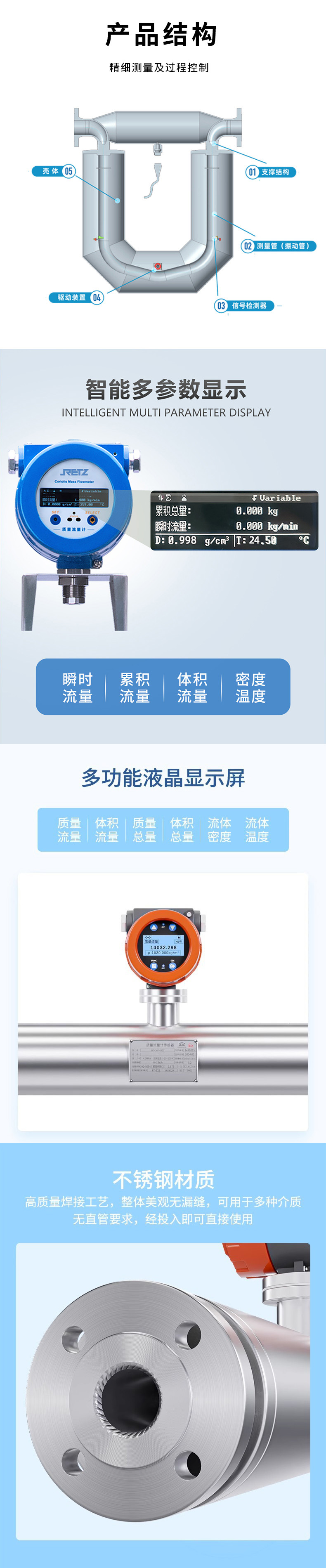 测量准确度高,质量流量测量精度可达到0.1%~0.2%,密度测量分辨率可达到0.001g/cm3;温度测量误差小于0.5度;