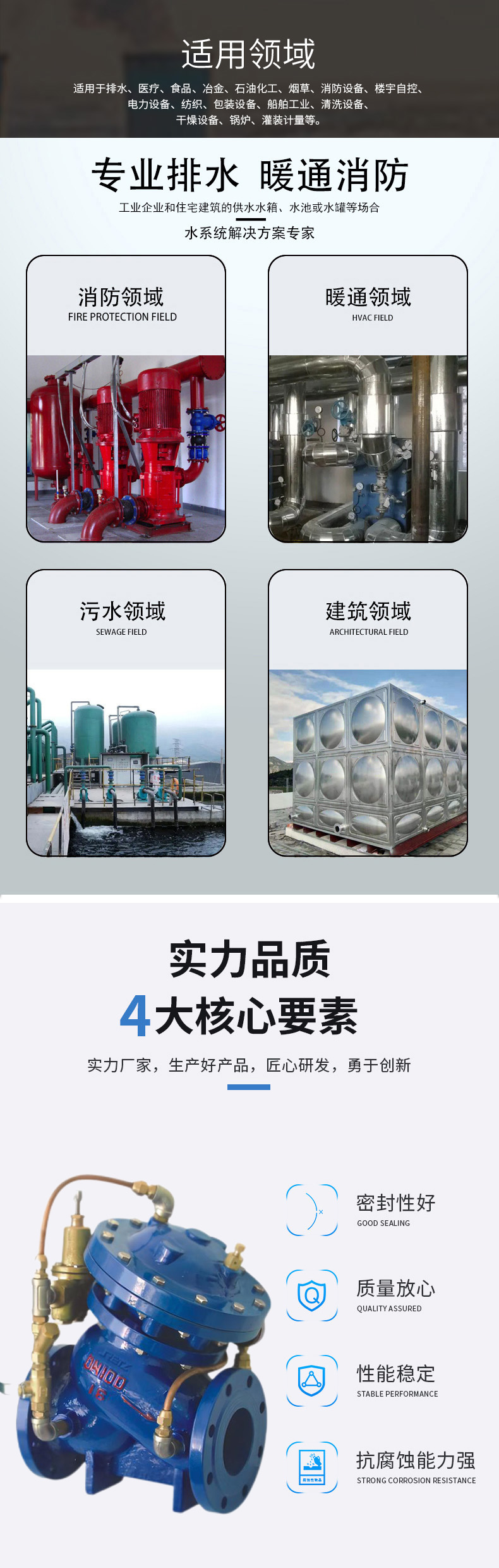 3、运行安全,关闭速度可调,阀门动作平稳,启闭不产生压力波动,无管振和噪音Safe operation, adjustable closing speed, stable valve action, no pressure fluctuations during opening and closing, no pipe vibration or noise