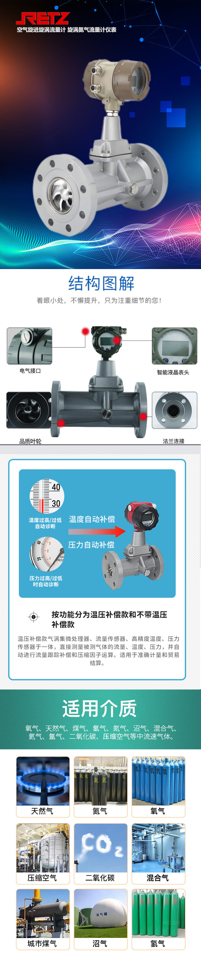 RETZ氮气空气旋进旋涡流量计无机械可动部件,不易腐蚀,稳定可靠,寿命长,长期运行无须特殊维护;表头可360度旋转,安装使用简单方便;读数直观方便,可直接显示工作状态下的体积流量、标准状态下的体积流量、总量,以及介质压力、温度等参数;转换器可输出频率脉冲、4~20mA模拟信号,并具有RS485接口,可直接与微机联网,传输距离可达1.2km;与IC卡控制系统配合使用可实现预付费和流量控制功能