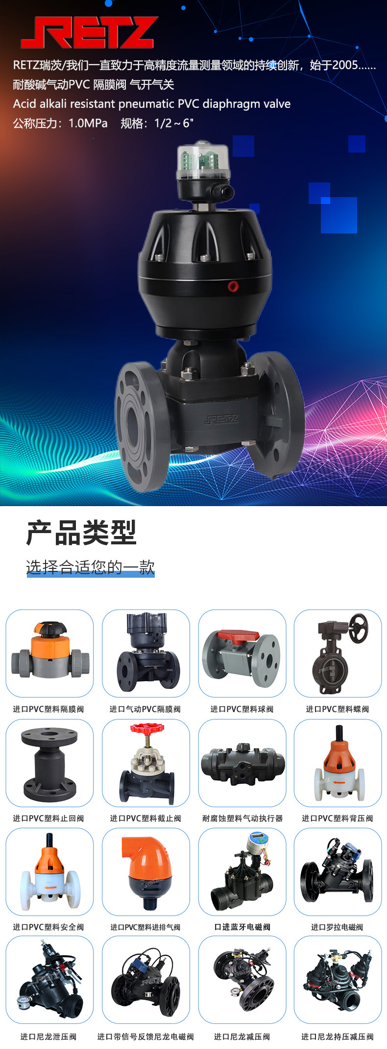气动PVC隔膜阀其结构上采用带有耐腐蚀衬里的阀体和耐腐蚀的隔膜,无填料函结构,节流元件为弹性隔膜,阀体流道平滑。这使得阀门具有阻力小、流量大的特点