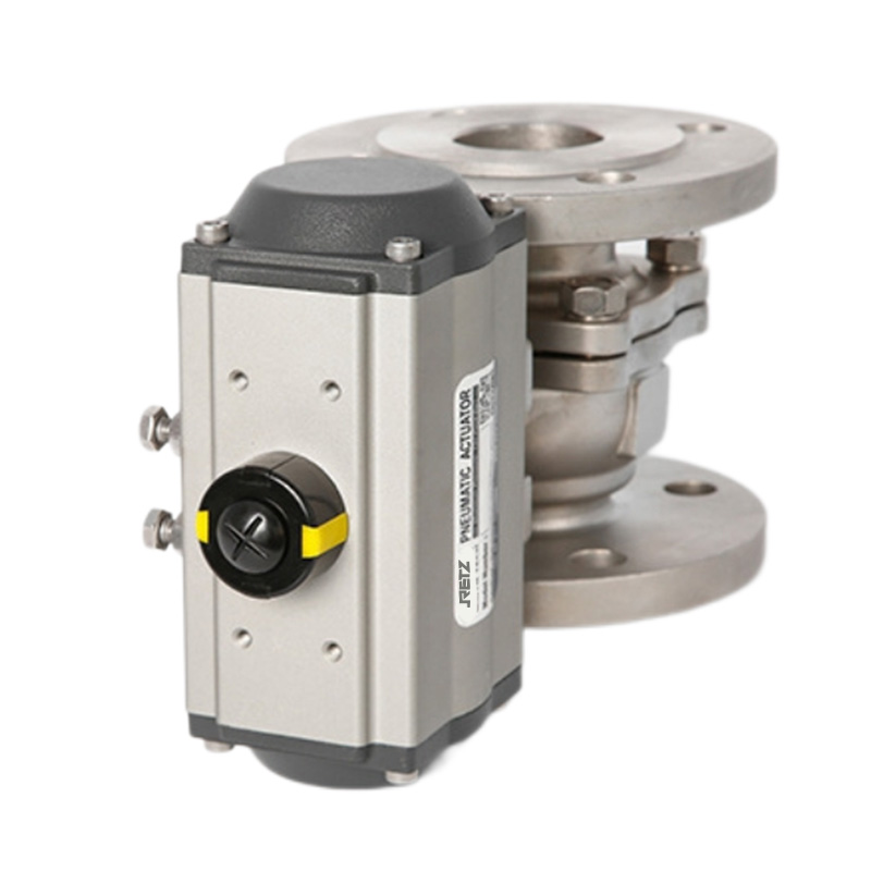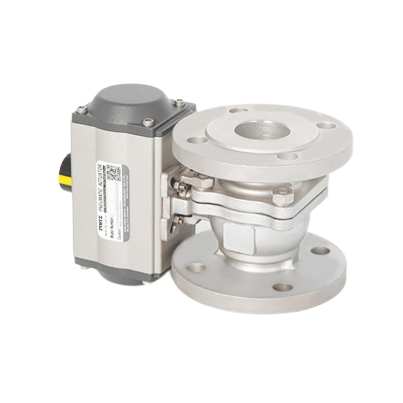 气动O型球阀的阀座多选用聚四氟、对位聚苯等高分子聚合材料,密封性能好,但材料相对较软。由于材料较软,但又要达到一定的密封比压,势必增加启闭扭矩,为了尽量改善此种情况,本公司采用双斜面弹性密封圈或V形槽弹性密封圈结构设计,利用管道内压力推动球体,帮助密封。当介质压力较小时,密封圈与球体接触面积较小,故有较大的密封比压,确保可靠密封。介质压力较大时,密封圈与球体接触面积增大。故密封圈能承受较大的介质推力而不会损坏。对于工作压力很低的球阀,考虑到介质压力不能确保阀座可靠密封,而预紧力长期使用后又会衰减,故对于低压、压或真空工况用球阀,采用弹簧加载的阀座密封结构,能确保球阀长期可靠的密封。