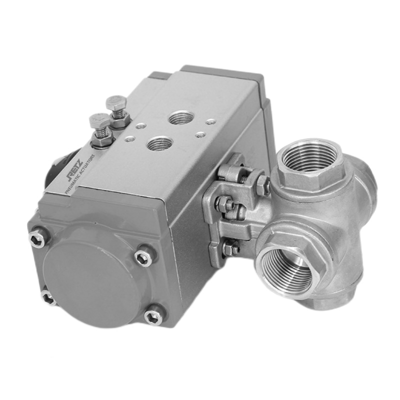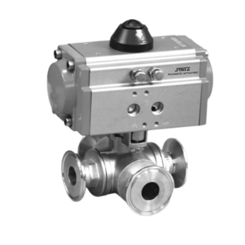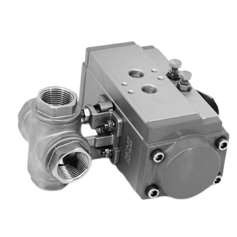T型通道球体功能,球体可将一条进口管道与三条不同的出口管道连通,或者将三条进口管道的流体汇聚至一条出口管道,通过控制球体的旋转角度,能在0°- 90°(或设计的特定角度范围)内实现对各出口管道流量从完全截断到按比例分配。
