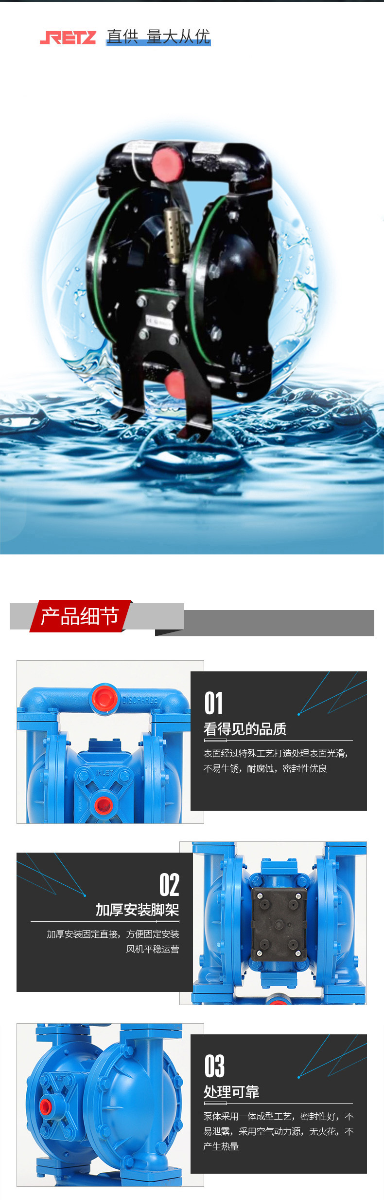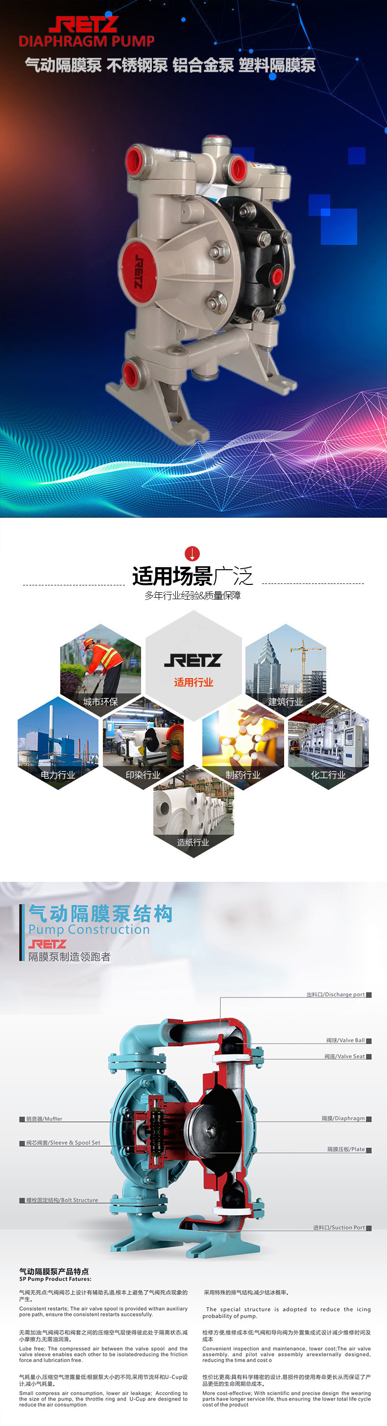 retz隔膜泵对于各种腐蚀性液体、带颗粒、高黏度、易发挥、易爆、剧毒的液体、陶瓷釉浆、果酱、胶水、油轮仓底油回收、临时倒罐等液体均能予以抽光吸尽。泵体流过部件材质采用不锈钢、铝合金、铸铁,塑料,隔膜根据不同液体分别采用丁晴橡胶、氟橡胶、氯丁橡胶及聚四氟乙稀四种。