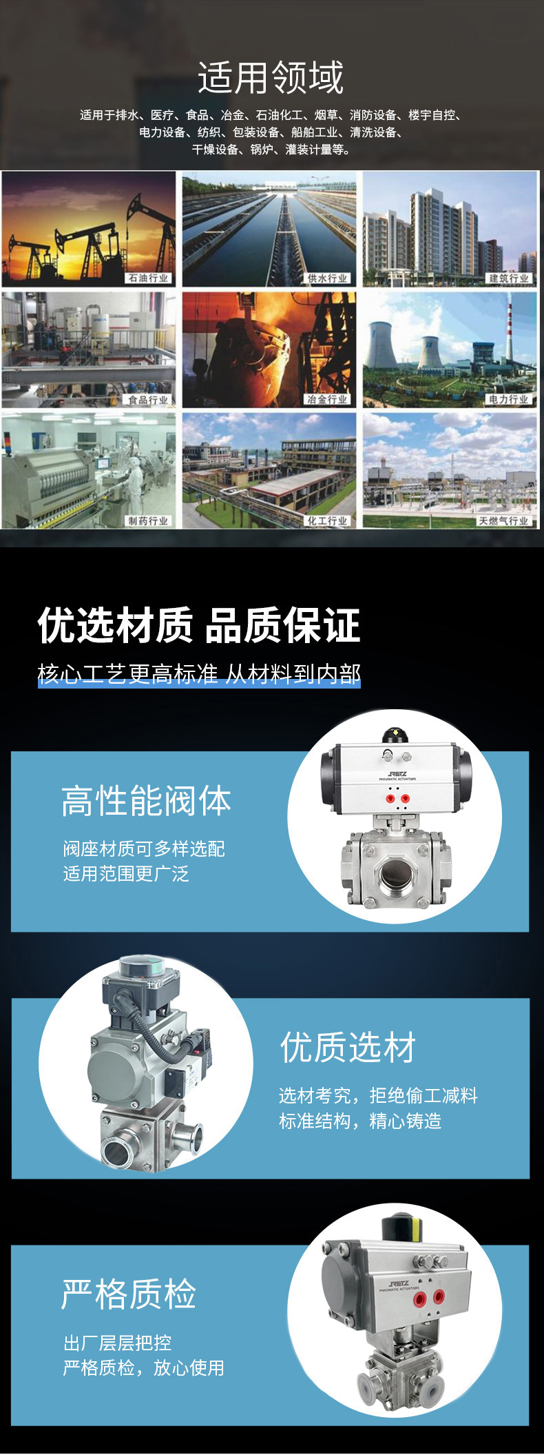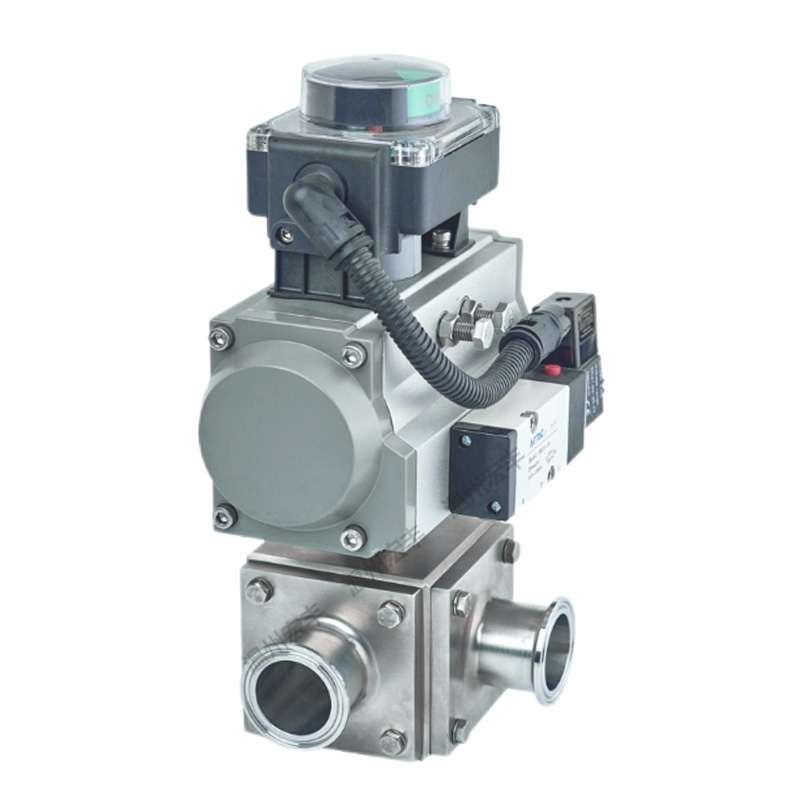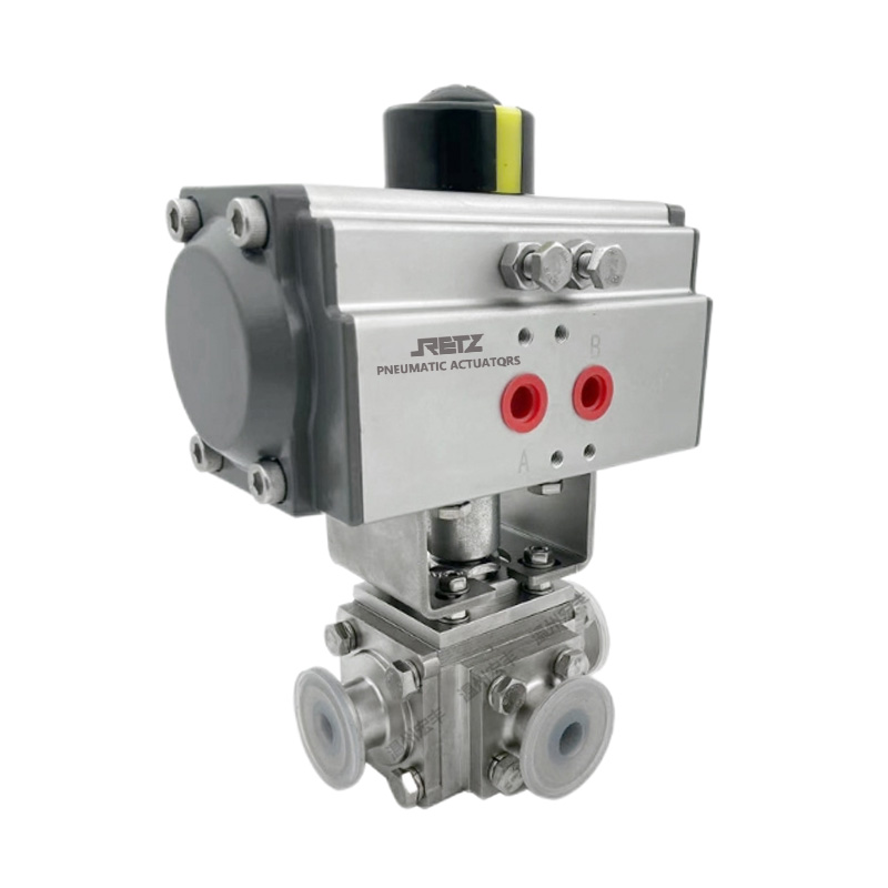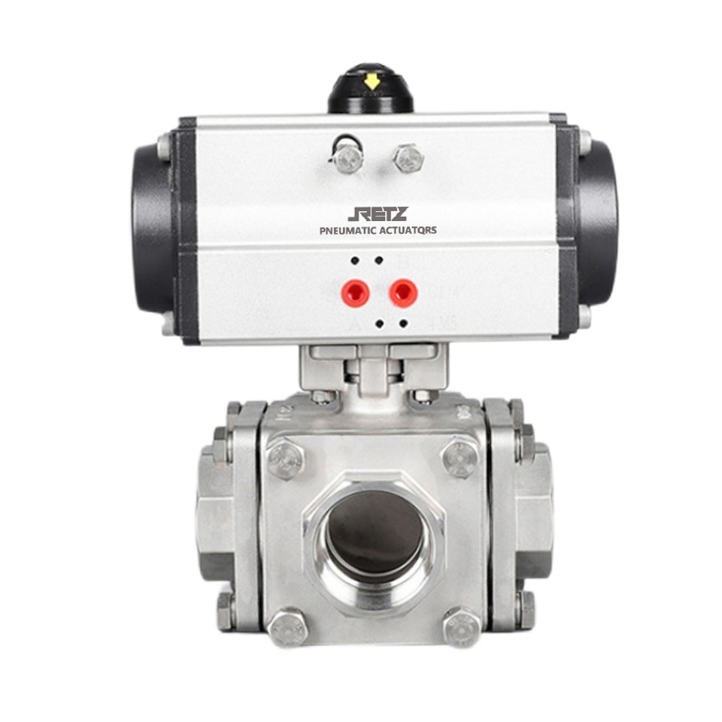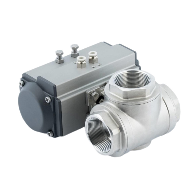 三通式气动球阀可实现三条和多条管道以阀为中心相互联通以切断功能,起到分流、合流作用,采用L型、T型双L型阀芯进行转换、适用于多种复杂工艺管道