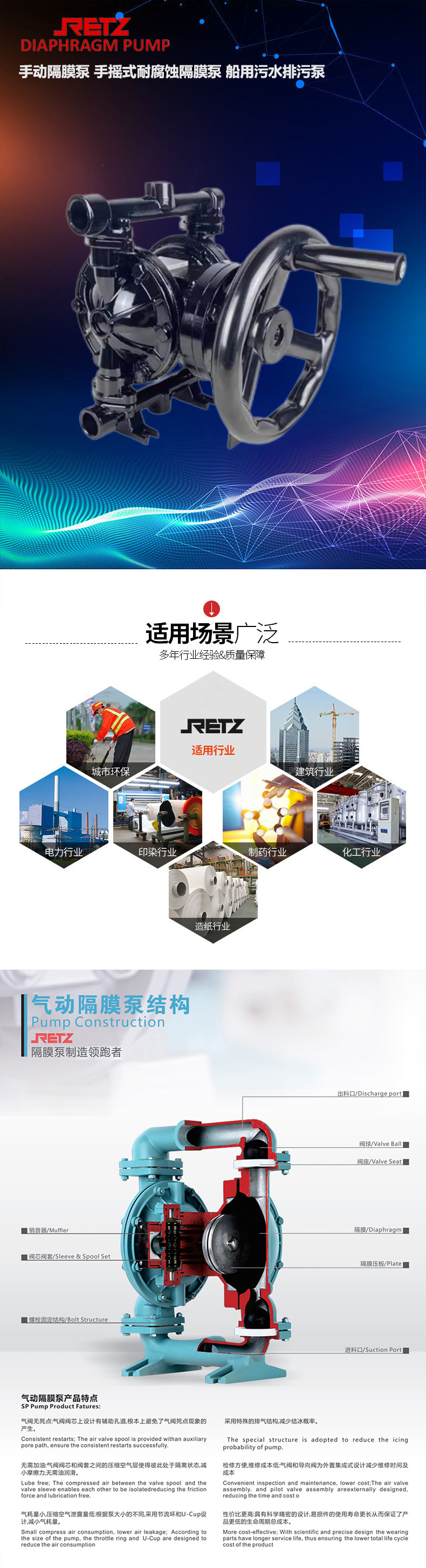 retz手动隔膜泵既能抽送流动的液体,又能输送一些不易流动的介质,具有自吸泵、屏蔽泵、泥浆泵和杂质泵等输送机械的许多优点。